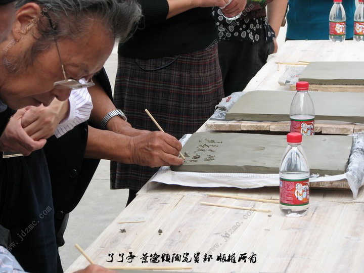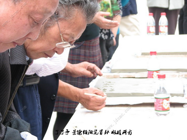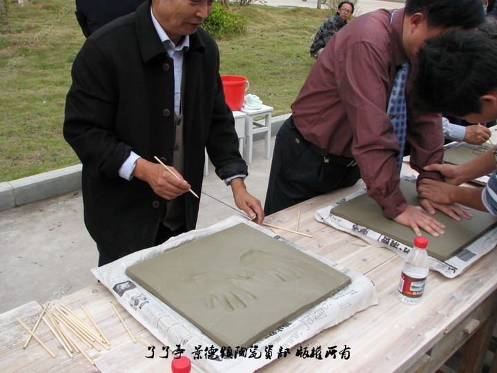 这一次大师们我是独自一人全程陪同,左右伺候,都是老人家了,又是国宝,有个闪失愧疚不已。因为陶院没有安排专车接送,于是大家都在校园里面徒步到工程训练中心去完成下一个项目,印手印,这些手印共100多块,将作为陶院永久收藏并展示出来。中饭过后,年轻的大师们另外行动,我就陪同一批老大师。我们先是长途跋涉到了工程训练中心,到达时间是1点钟,活动安排上写的是2:30分开始,于是我找到门卫打开了一个3楼教室供老大师们休息,可是大家爬到3楼以后,都累的气喘吁吁。可是休息不久我和宁勤征大师通电话才了解到地点更改了,于是老大师们又重鼓力气下楼继续前行了500多米才到达。 视频:大师们印制手模的过程