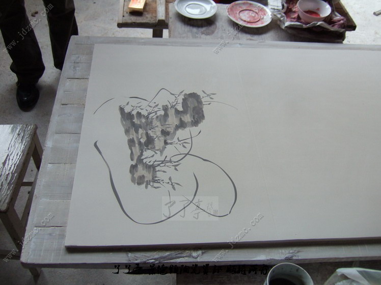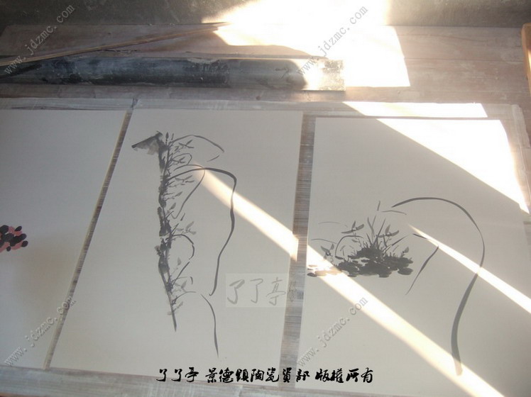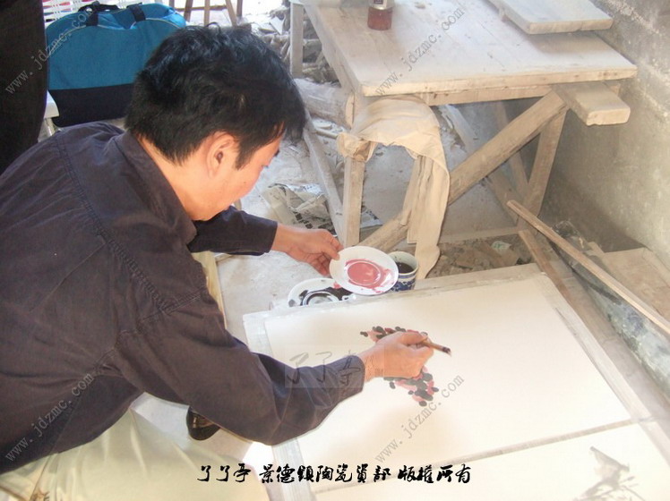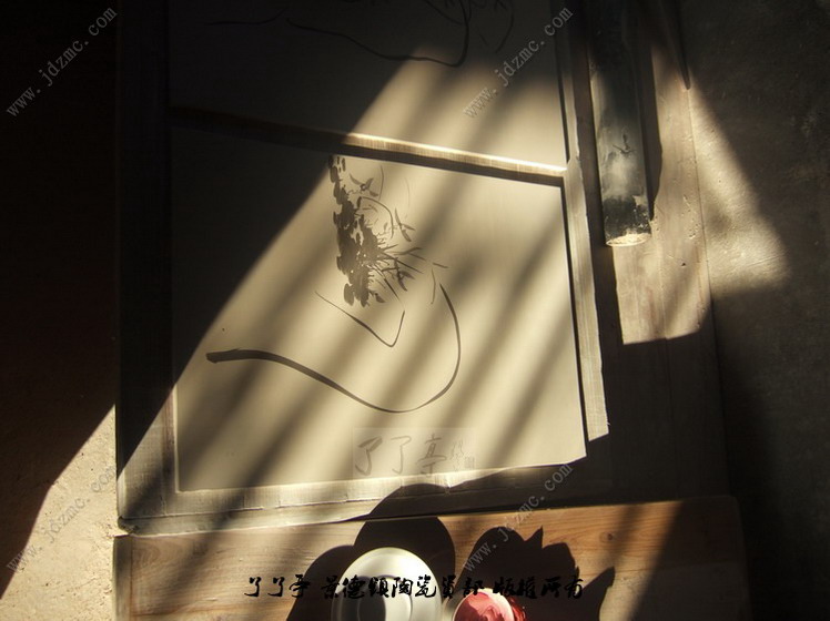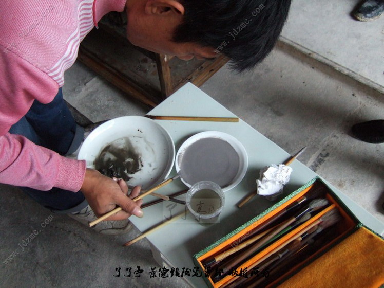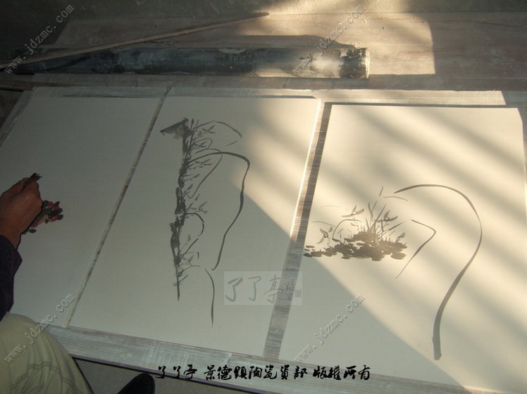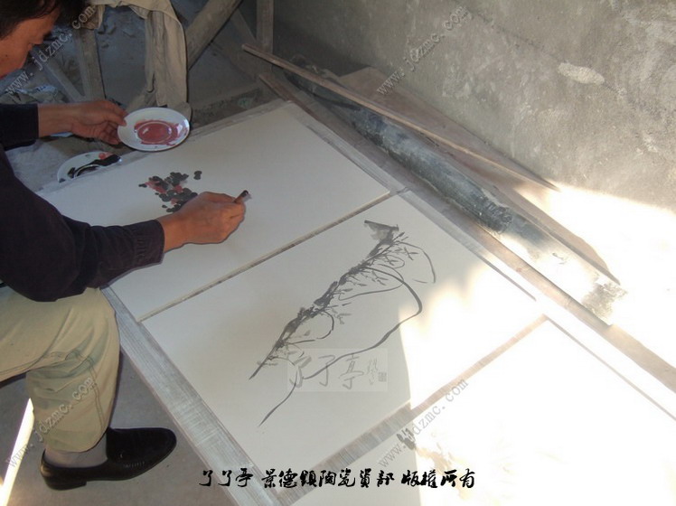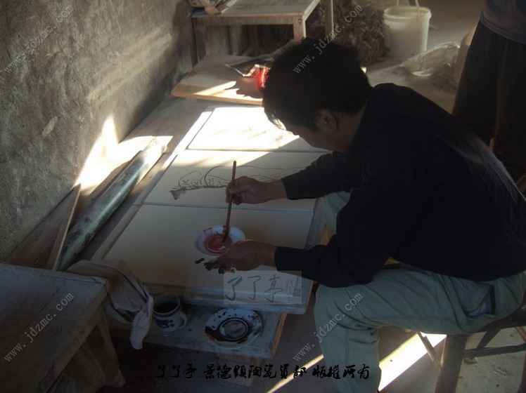 昨天和今天乐峰教授画的是瓷板,两天的时间搞定了30块,一个字“强”啊。一块瓷板,我们要求窑主分成3块,昨天画的是青花,今天画青花釉里红。乐峰教授对釉里红的料性难以掌握,于是江老师亲自上阵帮助他磨釉里红的料,演示厚度等等。但是这个窑是烧青花的,虽然老板愿意多用一些气来烧釉里红,但是毕竟这个窑口不是专业的,不知道最后的效果会是如何的情况,总之我不是很看好。但是乐峰教授却赌性很浓,希望整出一个极品来到嘉德拍个大价钱。了了亭·李申盛/播报