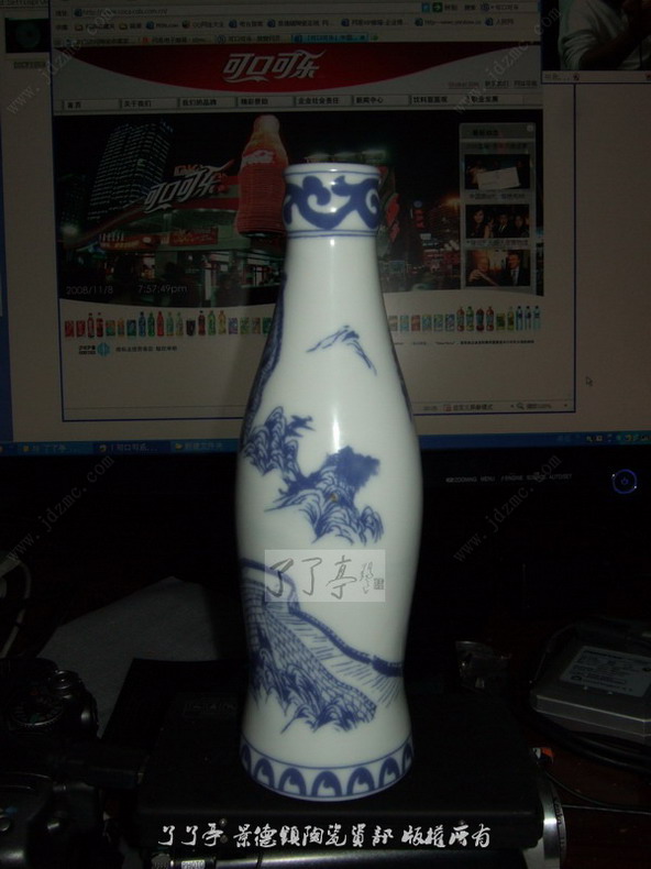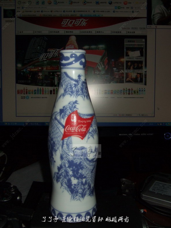 今天到坯房里面去选胎,在样品房间里面的一个很不起眼的角落里面发现了这个瓶子。可口可乐罐官方的瓷器瓶。这个瓷器是可口可乐1块钱的那种玻璃瓶的瓷器版本,是可口可乐公司官方定制的东西,做出来的所有的成品无论任何情况全部收走,可是却遗留下来了这个样品。呵呵,检漏啊,检漏。也许对于很多收藏者来说这样的东西算个屁屁,可是对我来说是珍宝,我是喝可口可乐长大的一代人,不敢说被美式文化同化,但是也在默然的接受。全世界有很多可口可乐罐的收藏群体,我虽然没有收集过,但是也感觉到这是一件值得珍藏的东西。
