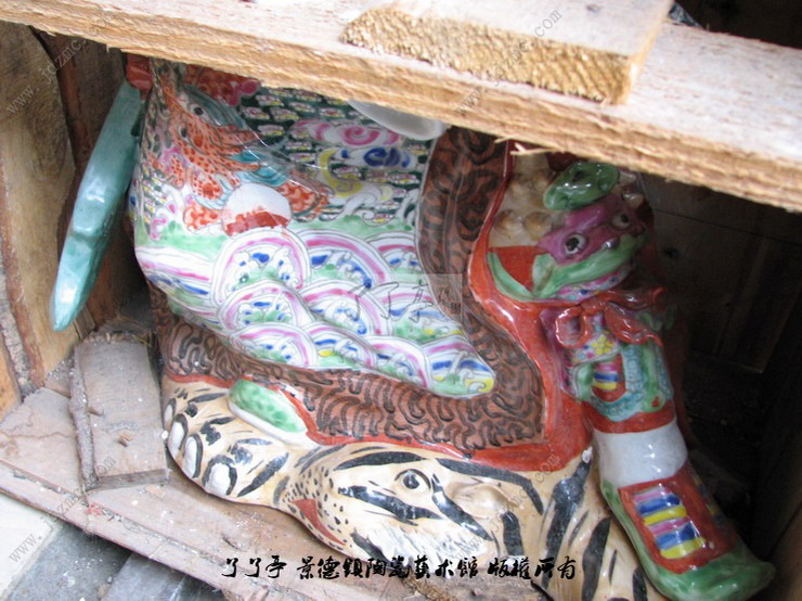 因为武汉一个朋友在办公室要供一尊关公的雕塑,托我到处寻找一下。在市场上,我看到的都是比较大型的关公,大多是全彩色,关公一手提青龙偃月刀,一手扶髯,眼睛炯视前方,喷了金粉的大刀熠熠生辉。好像这个雕塑形象是景德镇传统的关公雕塑的主题,以前看到过拿着一本书的关公,但制作不是很精美。景德镇传统雕塑陶瓷关公的形象面部以美髯、虎眉、凤眼为特色,怒目而视,蚕眉紧锁,威武不可侵犯;其服饰则多为头扎巾纶,身着战袍,脚蹬战靴,基本上都是粉彩填色,只不过图案和填彩的水平各有不同。前面几个图片是价格比较便宜的关公,几百块钱,后面一种就是非常精细的关公,大约27公分,制作精良。了了亭·李申盛/文 |