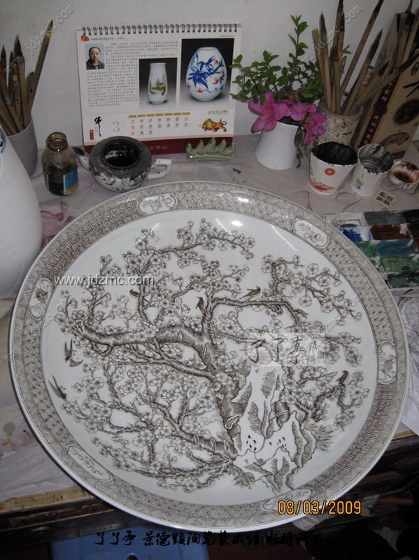 这是本人定制的一件张万莲的古彩作品,200件的大瓷盘,这件定制作品相对她以前画的已经有了不少更改,总的来说个人还是比较满意的,但是美中不足的是右手边的三只鸟的形象完全就如同一个90度的角度变化,鸟儿的形态没有什么大的变化,只是放置的位置改变了而已,在提出这个意见后,张万莲拿起刀片就把鸟儿的头给刮掉了。后面还有一个茶叶罐是我定制的,明天就可以去拍照了。了了亭·李申盛/报道