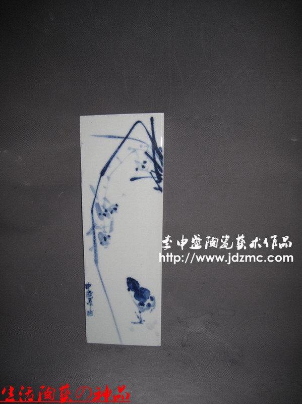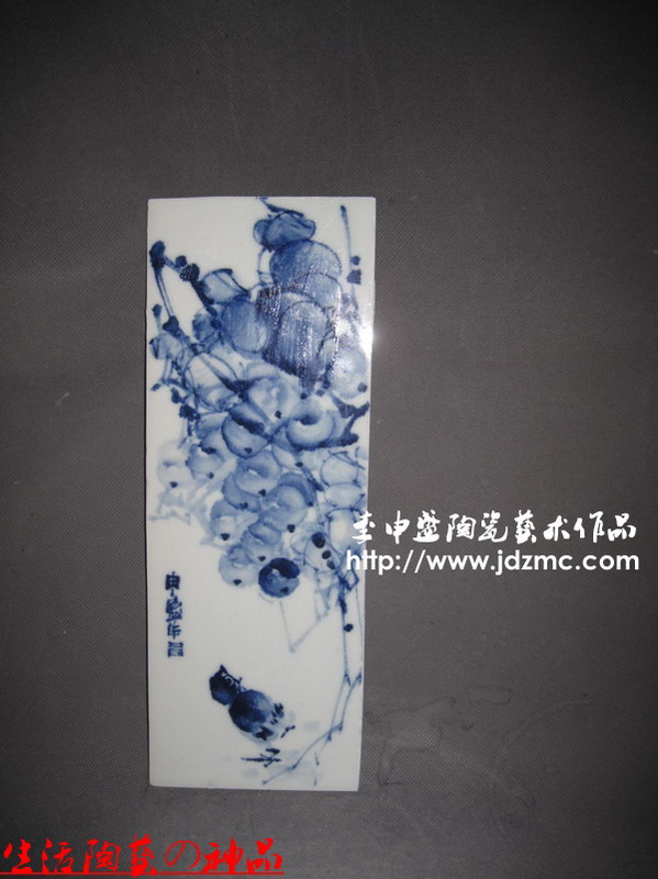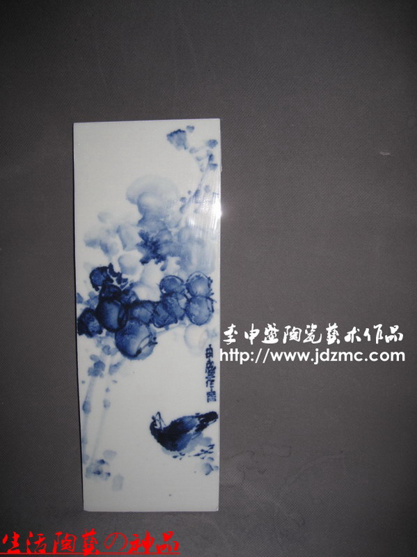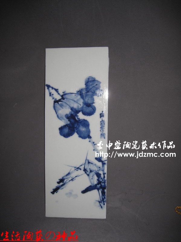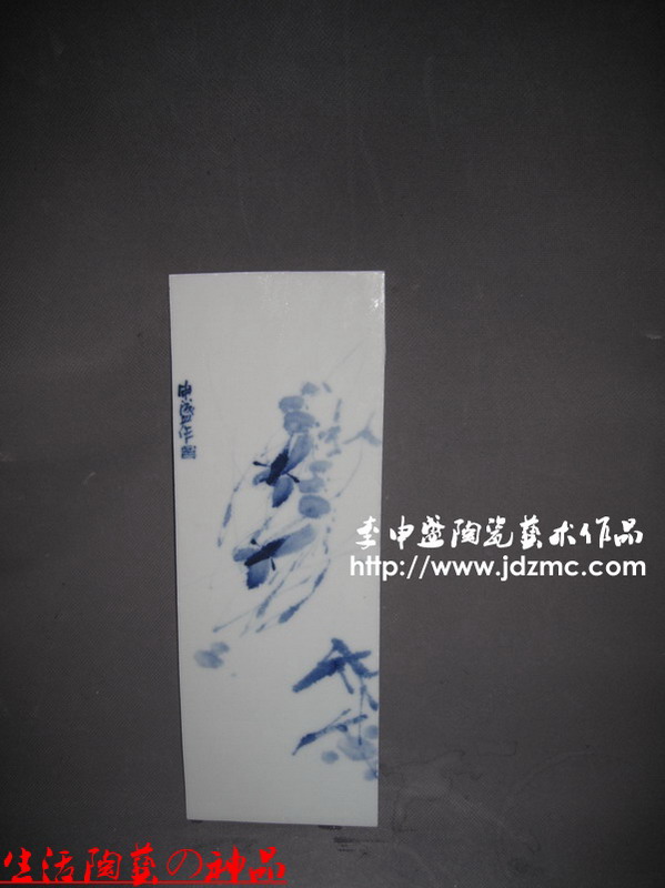 绘画作品一直都是我考虑涉及的一个方面,我个人绘画水平不高,以前多位大师愿意好好给我授课,我像逃学一样,找着理由不去听课.那个时候有两位老师还愿意亲自上门给我做指导,我那不爱学习的毛病使我今天懊悔不已。现在多是在一些小老师指导下完成的。之所以叫做小老师,只是他们年龄都比我小,但是画艺都比我高。从颜色釉入手,陶艺之路我也不想做停歇了,青花和青花釉里红文人画,将陆续推出。这8块作品是从一个大瓷板上切割下来的,是一位武汉的朋友点名制作的,为的是装饰客厅,贴在瓷砖上。瓷板不用镶木框,条形构图,本定是六块,看见瓷板上还有位置,于是补送了两块。(了了亭·李申盛/文)