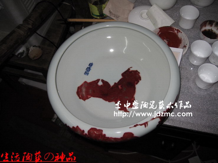 跟艺术界的朋友们混了几天,在大家左右帮衬下,整了点青花釉里红的螃蟹出来。这釉里红要发好颜色,不能用好泥巴,只能用390的,另外釉也是窑主自己配的。可是利坯的原因,在烧制的过程中有两个沉下了点,结果粘了棚板。我安排去张万莲那里斗古彩,下面斗个章子,上面斗个菊花。本来就是想搞青花釉里红斗古彩的,这一次非斗不可了。这一次出的三个都好,才开窑拿到手,给一个朋友已经预订跑了。