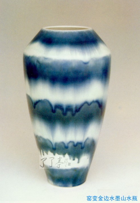 窑变金边水墨山水瓶2002年创作。该瓶经1 370摄氏度以上高温一次烧成,自然变化出蓝天、白云、青山、绿水的美丽图案,酷似一幅水墨山水画。更为奇特的是在青山和蓝天的交界处窑变出了一条金色的彩带,好像一缕金色的阳光洒满山头,奇妙极了。