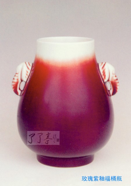 作者经多年潜心研究,终于在1 995年研制成功玫瑰紫釉。釉面呈均匀的玫瑰紫色调.光亮透明,有均匀的小碎纹又属裂纹釉。制品稍有脱口.脱口处显露出玫瑰紫釉的过渡色调十分自然和谐。玫瑰紫釉福桶瓶器型源于故宫藏瓷鹿头尊,但将瓶耳改为象头.象征吉祥,瓶身大小也作了相应调整,整件作品给人端庄大方,丰满福态的美感。同时又有紫气东来,迎春接福的好兆头.是一件有较深文化内涵的陶瓷艺术珍品。