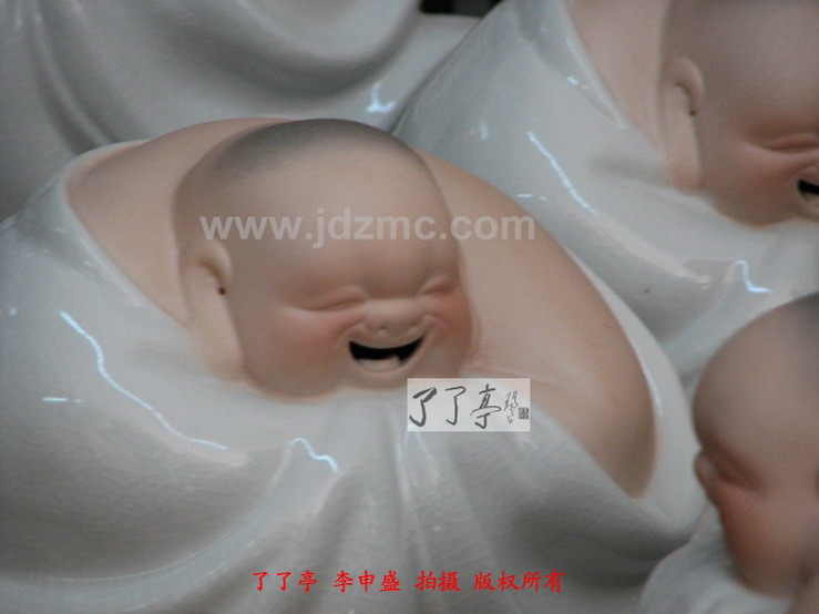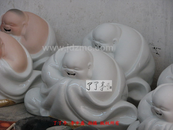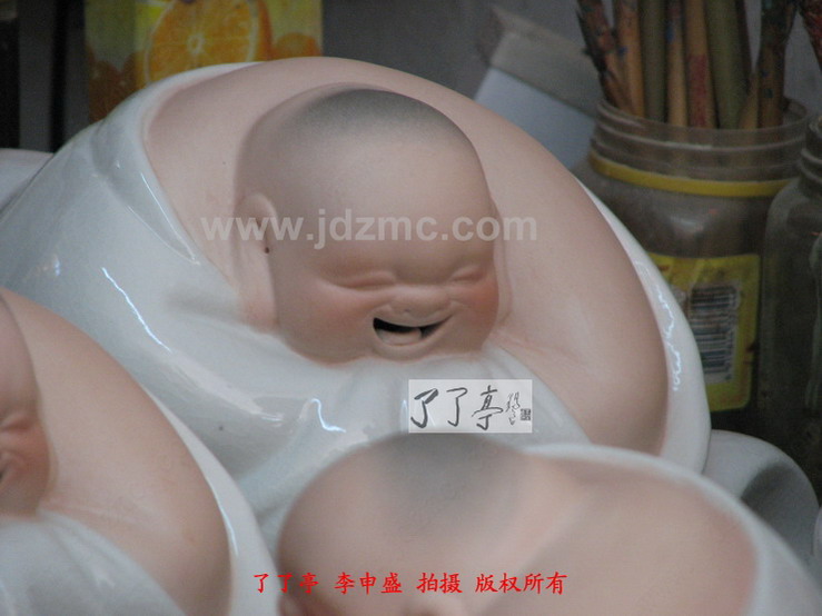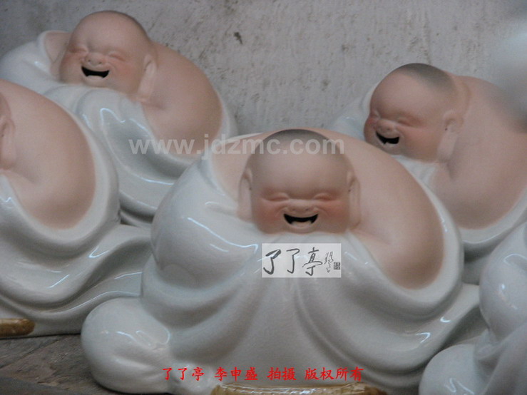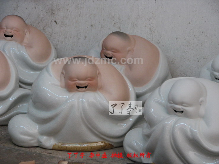 曾经笔者都一度认为哈哈罗汉的仿制现象是刘远长大师同意,或者至少是默许的,因为大量的仿制品,防止作坊就在他的身边,就在他眼皮子底下天天制作出来。这些行径刘远长大师应该是很了解的,而刘远长大师一直都未对这样的现象有过说辞,所以我才误认为刘远长默许了。默许的原因有三,第一刘远长曾经是厂长,会考虑将模具贡献给大家进行制作。第二,许多作坊,甚至许多家庭是靠仿制哈哈罗汉为生的,有大的,有小的,有白纹片的,有青花斗彩的,颜色釉,嗨,等等等等。第三,时间已经过去了十年,(1988年是刘远长哈哈罗汉定型时间,这一点可参考刘远长出品的哈哈罗汉的底部签名处)难受到难过再到习惯应该是刘远长大师对天女散花、哈哈罗汉仿制情况的最好总结。