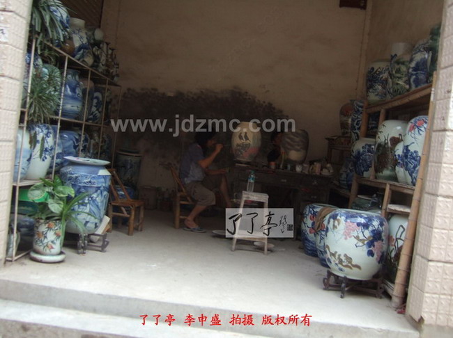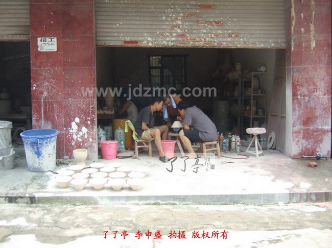 景德镇有个叫老厂的地方,这个地方在政府没有强行管制划分制作、烧窑区域之前那里每天都是车水马龙,全国各地的商家都会到这里来看看,进进货。一条小街上几乎家家户户都是做陶瓷的,每一间小屋里我们都可以看到拉坯、画画、雕刻、镂空出各式各样的花瓶器皿。这里瓷器的所有工序都是分工十分的齐全,大量的窑口聚集在这里,多数隐没在巷子里。因为在这里分工非常的详细,瓷泥的提供有专业制泥作坊,做坯的有专业的拉胚作坊,画釉上、画釉下的,甚至可以具体到种类,比如我可以找到专业画釉下人物的,也能找到专业画釉上山水的,瓶子上的装饰花纹乃至雕刻,均有专业的工坊和人员。成品后,就近送到附近的窑口,因为每天的成品多,所以不多等很长时间窑主就能满窑烧制。