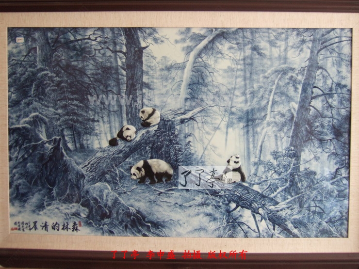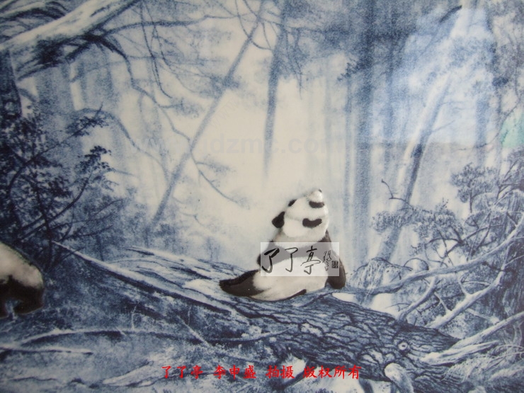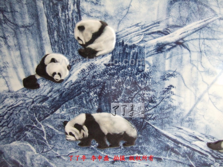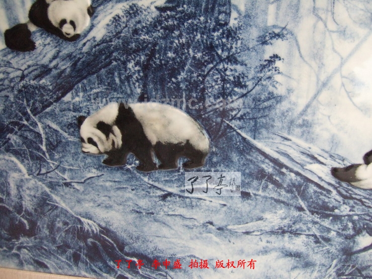 宝宝2岁了,除了知道姚明加油、奥运加油外,再就只剩下熊猫了,因此我也很注意市面上画熊猫的艺术家。画大熊猫好像最简单,只需黑白二色,但画出味道的确实不多,如果要求画的可爱更是难寻。彭兵老师是我的一位老朋友只是不常联系,平常只知道他喜欢画山水,却不知近来喜欢上了青花斗彩走兽了。那一天我带着老婆孩子一起出去玩正好碰到了彭老师,来到了彭老师的工作室,一进房间一块熊猫的青花堆釉的瓷板放在一角,宝宝突然兴奋起来跑了过去在上面摸来摸去口里只喊“熊猫、熊猫”。彭老师也很高兴,但他告诉我这一块作品他本人也不是很满意,有些动作不是很传神,他重新绘制了一块,可惜我发现这块重烧制的惊裂了,但是作品画的确实传神多了,熊猫活了,因为保密要求,这一块瓷板的图片就不提供了。这种画面能够完成的不多,因为熊猫是堆釉,堆出效果是第一重要,另外表现出毛绒绒的效果很难,画面出的不好的话给人的感觉很突兀。好了,不多废话了,让我们来看看作品吧。了了亭·李申盛 实时播报