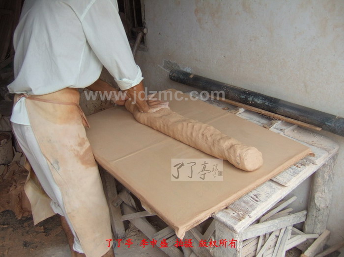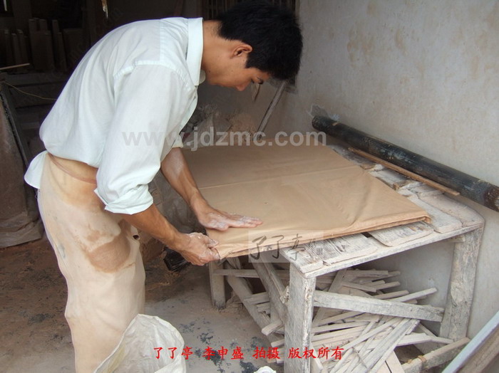 本次笔者为大家带来的是景德镇瓷板制作前段泥板制作工序,这类小型瓷板的制作对于景德镇来说不在话下,就是两米,三米的板子也可拿下。制作者首先在一个平整的木板上粘盖一层薄薄的纱布,然后将练好的泥巴放在木板上。在木板的两侧各放置一个木条,这个木条的主要作用是规定泥板的长度和厚度。然后压实泥巴,将一根铁质桶在上面滚动,通过铁桶的滚动压实、平整了泥板的形状。整块泥板的制作分为两次,铁质桶从中间向上、下两边各做一次重复。然后将多余的部分用刀切掉,随后抬出去晾干。这两块瓷板如果提供青花绘制加上烧制预计成本在百元以上,只是绘画条件不好,文字多地方小,不过大家谁有兴趣了我带您去玩玩。了了亭·李申盛/播报