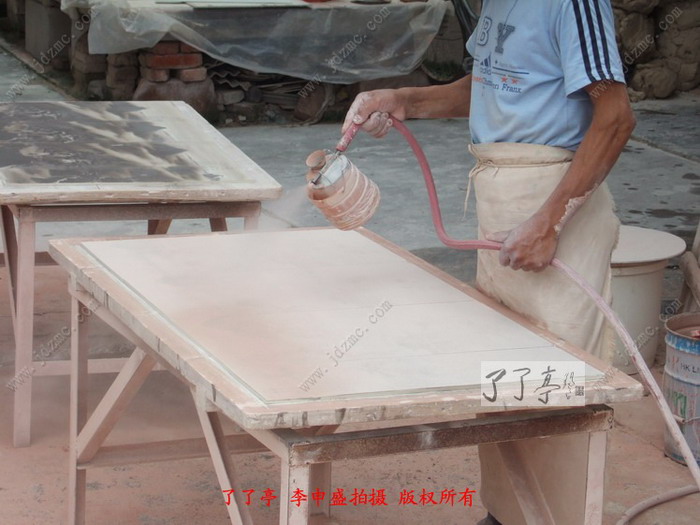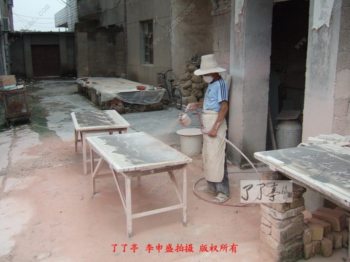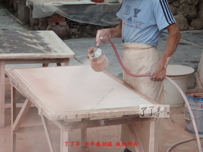 如果大家还把吹釉定位在老一代的方法就不适宜了,但是全人工吹釉的录像我现在是找不到了,只找到了这种机器吹釉的视频,大家凑合看看。人工吹釉是用一节竹管,选择其中的一段用细纱蒙上,然后蘸取适量的釉浆,对准需要施釉体的泥巴坯的施釉部位,用嘴对着竹管另外一端,运用技巧适量的吹气,气体将釉浆穿过纱孔形成雾状附着在泥巴坯的表面上,经过反复吹釉,得到适宜厚度的釉层。因为各种器形泥巴坯体的要求不同,这样的吹釉少则吹两三遍,多的要吹十几遍。而机器吹釉就简单多了, 拿着对着喷就可以了,当然也有一定的技巧使得釉体的厚度均匀等达到一定的要求,了了亭 李申盛/实时播报。