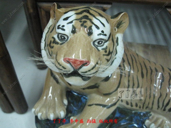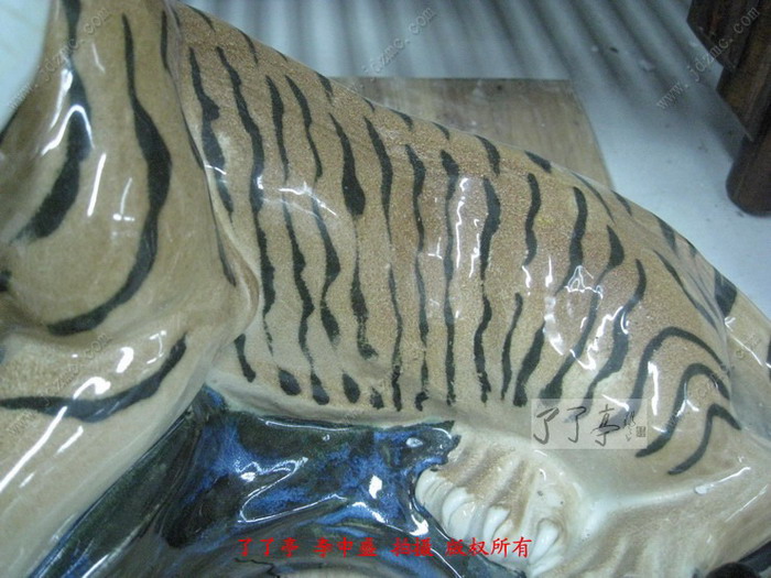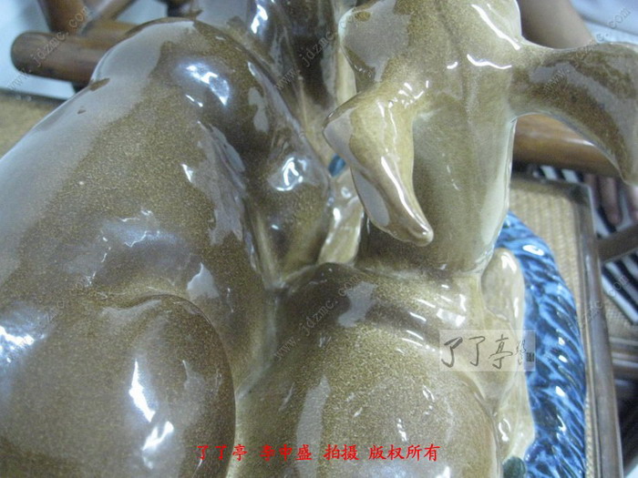 王龙的动物雕塑系列作品给我的感觉是一种鲜明的对比、其使用的高温色釉材料表现动物皮毛的颜色和纹理颇具特点,赋予了一种对于动物具象雕塑厚重和自然的关爱。 王龙的高温色釉能准确地诠释大自然与动物特性的融合,利用高温色釉将皮毛的表状制作的活灵活现,在图中大家可以看到皮毛上那种毛孔的表现很是到位。这样较为优秀的表现形式使得动物从塑性状态转变成永恒状态。以探究的质感、创新的风格、凝固的动作,淋漓尽致地表现了陶瓷高温色釉丰富纹理效果。了了亭·李申盛/播报