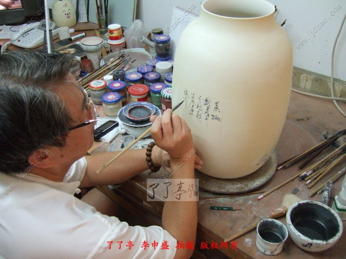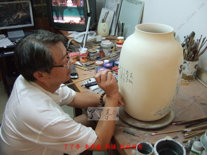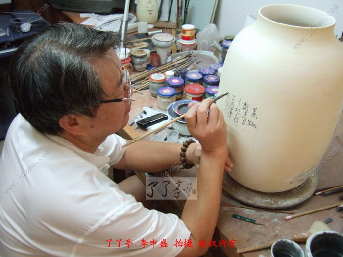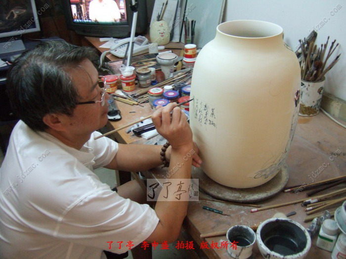 敢画不敢烧,现在是李一新老师矛盾的心理写照,在两次换窑以后,最近几个月烧制作品特别是大件作品屡次出现问题,要么是色彩发懵,要么是釉里红烧挥发,而且到今天为止,这股阴霾还在头顶挥之不去。前一个月从本站登录李一新老师的两个150件作品烧制前后对比文章的同时,李一新老师完成了两个300件作品,每一个300件作品李一新老师要耗时6天左右这六天中间不会画其他的任何作品,然后再画下面一个300件作品的时候中间李一新老师会停顿两天,可是耗时半个月心血的两个300件一个仕女图,一个竹林七贤都陆续因为色彩出现问题而令李一新老师很不满意,特别是后面一个竹林七贤是李一新老师专程为了了亭陈也君女士创新的一件作品,费尽了心力,用李一新老师在dv视频的话中来说,就是作者相当尽心尽力了,但能奈天何。