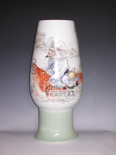 收藏家朋友非常满意这个瓶型,随后认可了母亲推荐的琴高跨鲤的画面,王老师没含糊,四个月后-2003年10月8日将一件“波涛汹涌中,跨一红色巨鲤破浪疾行的琴高画面”交给了母亲。画面中巨鲤姿态矫健,奋力前行;琴高昂首躬身,双手紧抓鱼鳍,表情焦急;身后水急浪高,画面动感极强,这一切无不渲染了一种紧迫迅急的强烈气氛。 而今这件作品已经作为了该收藏家的传家宝保存了起来。了了亭·李申盛/文