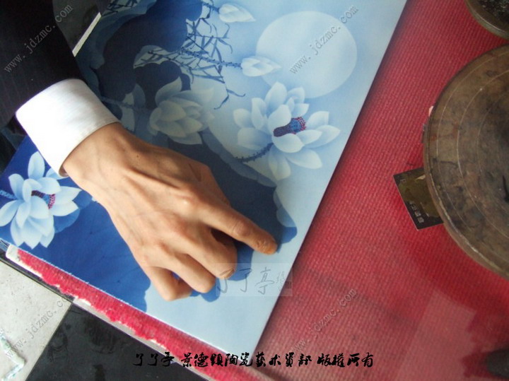 宁勤征大师的荷塘月色系列刷花瓷板是他的特色作品之一,有位藏友对宁勤征大师的画面中的一个局部不得解,笔者特意带着这个问题问询了宁勤征大师。问题简介:在画面的一处大块荷叶上出现了一处线状的分界。在图上大家可以看到。