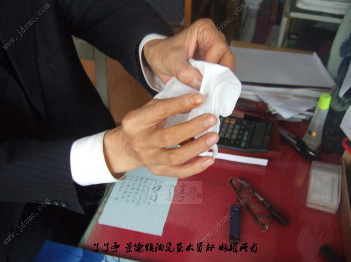 为此笔者一直等到了一块刷花瓷板请宁勤征大师亲自讲解了一下,宁大师告诉我们,这种表现手法其实就是荷叶一种转折的效果,首先宁大师拿出一张面纸做了一个形象的展示,随后又在纸上画出了绘制上几种变化,并告知笔者,荷叶上有虫眼虽然也是近代瓷绘表现模式,但是不同的视觉角度和荷叶生长变化也需要相应的表现出来。了了亭·李申盛/文