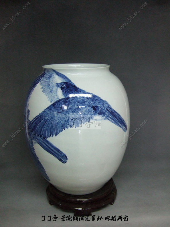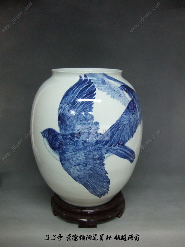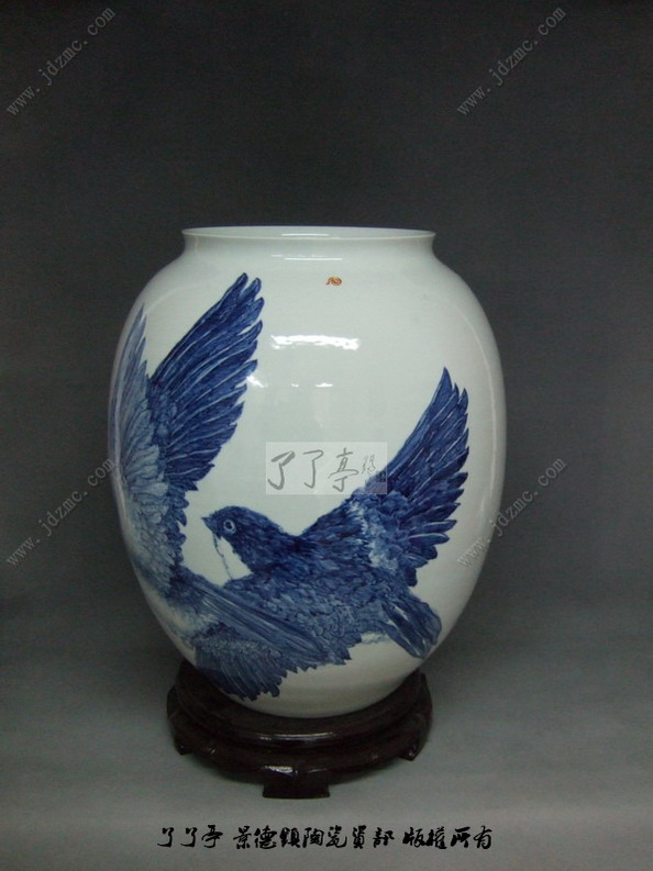画面中鸟的飞行姿态,表现了自然界中生命的一种追逐。作者的主体图案是第一张图片,有意使鸟儿的翅膀姿略微上倾,加强了一种力度,扎实的绘画基本功使作者能把对事物观察的细心和敏锐准确的再现于他的作品中。因此,单就艺术而言,无论是形象捕捉塑造还是青花绘画形式变化,都是很不错的一件原创型的作品。了了亭·李申盛/文