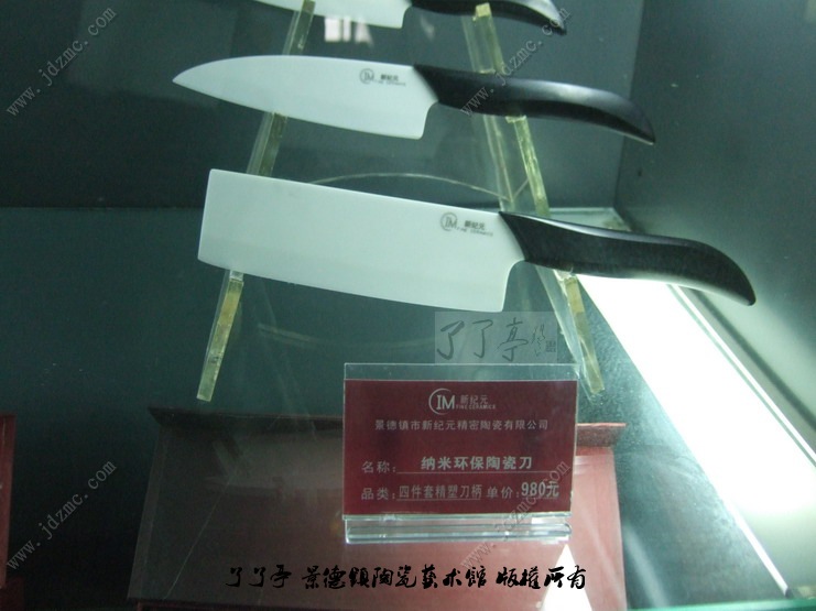 经常接到很多朋友电话问询纳米陶瓷刀具体的价格,其实我还真不知道,昨天接了个莫名其妙的电话非要我去找一下,想想早上没有事情就去看了一下吧。陶瓷刀我个人觉得放在宾馆和一些高档的餐厅、酒吧很合适,档次高,有品位,或者在某豪华别墅的酒会上、茶几上摆上几个陶瓷刀即有品位又实用安全。只是以后机场保安就麻烦了,这陶瓷的东西在过安检的时候不报警,万一有歹徒持械(陶瓷刀)混进去了造成“劫机”的结果咋办。回来后,我也问问老婆要不要摆一个在家里面用,老婆惊诧道:“不要、不要”。我问“为什么”老婆说:“我了解这刀,这刀多少年不用利刃,相当锋利,但是只能切,不等剁,好像是不怕摔,可毕竟是陶瓷的东西,难保不会摔坏啊,用着就担心,送送礼品合适。了了亭·李申盛/报道