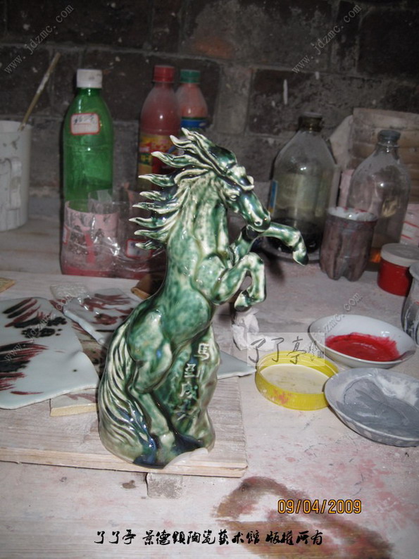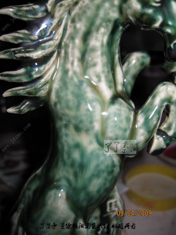 其实大家一直都有一个疑问,釉里红烧的能有多好,那么以下这几个图片就告诉您釉里红烧制到一个极端的时候会是怎么样的一个情形。这是一匹马,周身涂的是完全的釉里红釉体,没有加入其他任何杂釉,本来是一个试验品,加还原焰,温度其实并不高,但是出来的很神奇,特别是有蓝色色彩泛出。但这种完全的窑变您认为好看吗?
