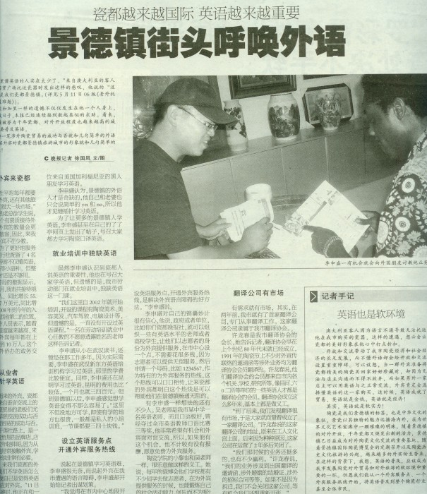 【瓷都晚报】“这里懂英语的人实在太少了。”来自澳大利亚的客人 加里在国贸广场托运瓷器时发出这样的感叹,他说的“这里”指的是我们瓷都景德镇。(详见5月11日06版《老外托运瓷器遇难题》)。