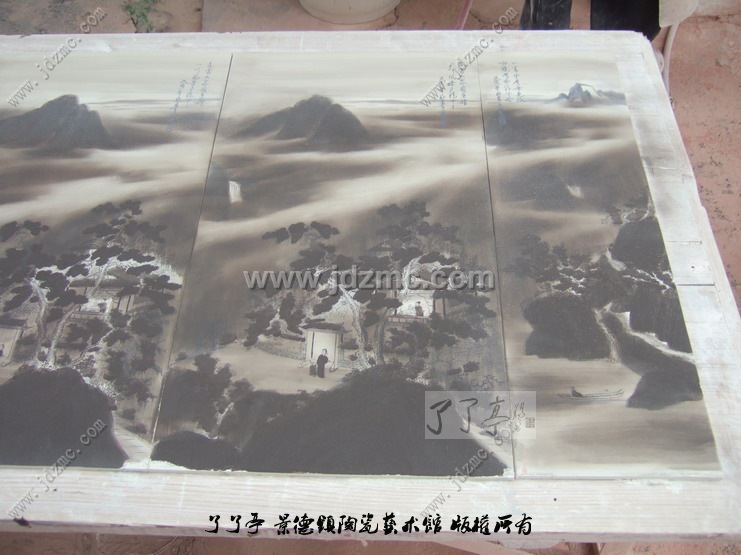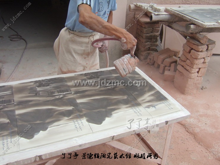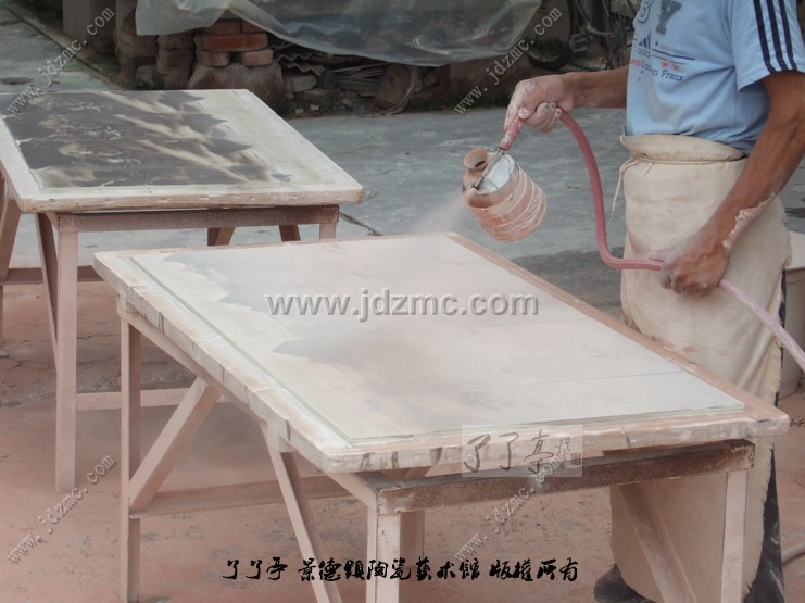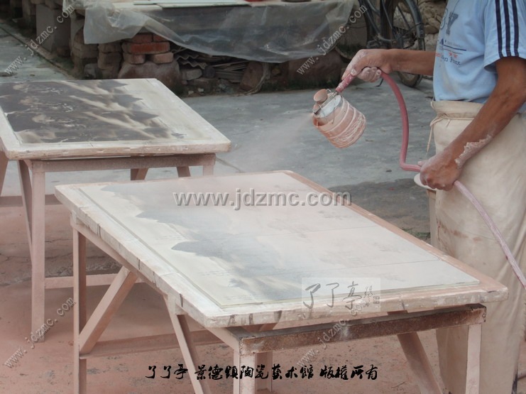 如今古玩能够飞入百姓家,与一些人和机构为了牟取暴利,制作了一批又一批的仿制品有着密切的关系。下面这几张图片,就是刚刚正在吹釉的几块民国八年的青花人物瓷板画。这些东西在市场上四面开花,用铺天盖地来形容一点也不过分。然而,艺术市场上的赝品泛滥,绝不是媒体上的几声吆喝所能够解决的。要想真正从根本上清除赝品,必须由政府有关部门出面,像打击假烟假酒一样重拳出击。可是政府有关部门虽然对珠山八友的仿制品进行过一次清查,那也多是作秀成分太多,事情过后,涛声依旧。其实,古玩仿制品销售情况往往优于当代艺术品,因而利益的驱动使得这个产业形成了一个相当的牢固的链条。