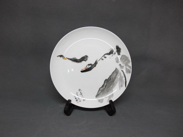 “复火”指的是瓷器成品后有些不足的地方重新进入红炉后烧制,新彩是釉上彩的一种,它属于那种可以“复火”,比如图片中的鸭子这个题材,先画了鸭子和荷花,就直接去烧制了。拿到成品后,我发现少了点什么,于是又点了几朵浮萍,再烧一次,成品中原来的颜色没有任何影响。 第一次成品 |