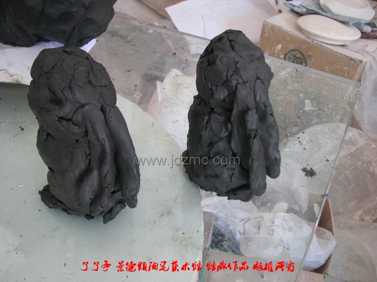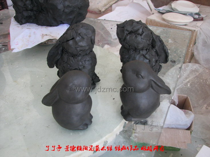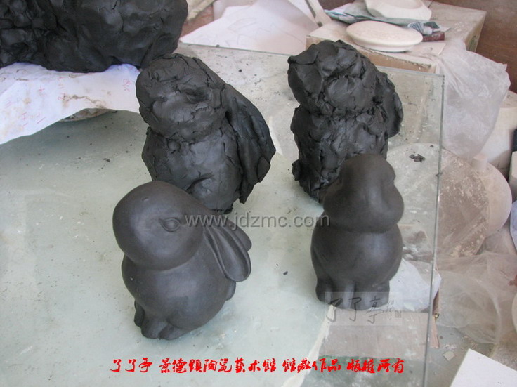在朋友们的关心下,我们加班加点的进行了原型创作,了了亭2011年兔年生肖雕塑即将推出,此次推出的兔子雕塑预计大小为成瓷10公分左右,由两只左右形态的兔子组合在一起。此次推出的兔年生肖通体施高温颜色釉,且施釉的品种众多颜色丰富。图片中是两个不同的模种,第一套兔子设计完成后,有些偏小,但也很可爱,留为备选,第二套正在制作。
