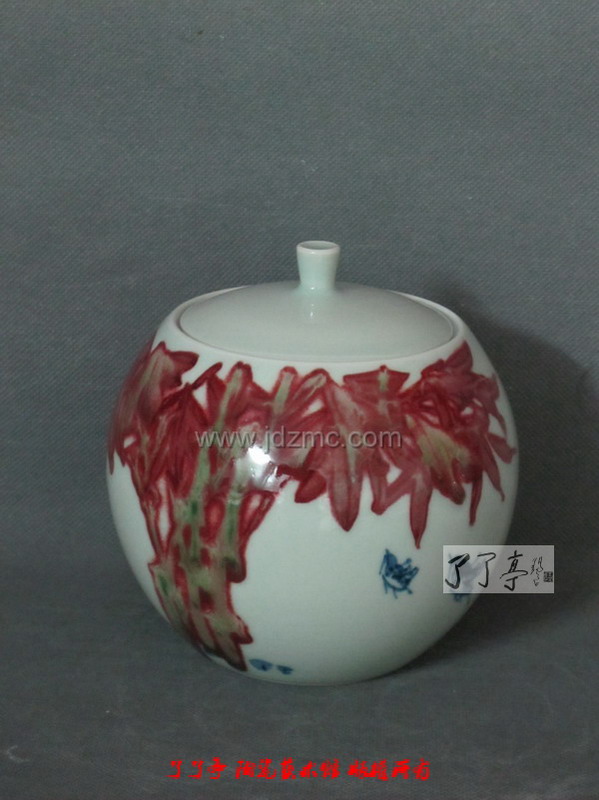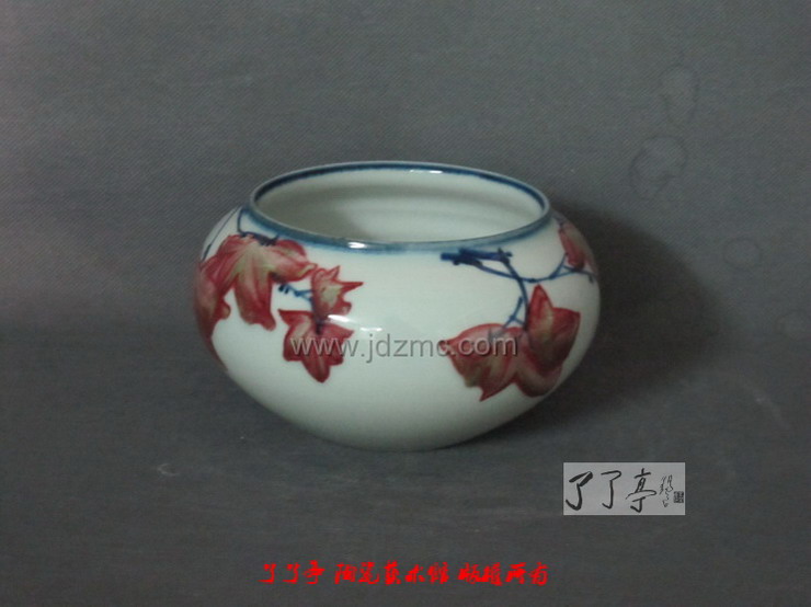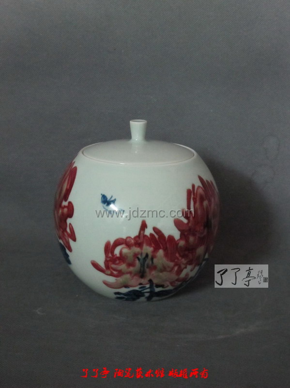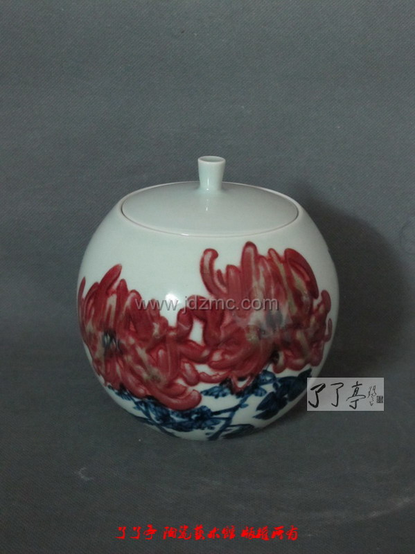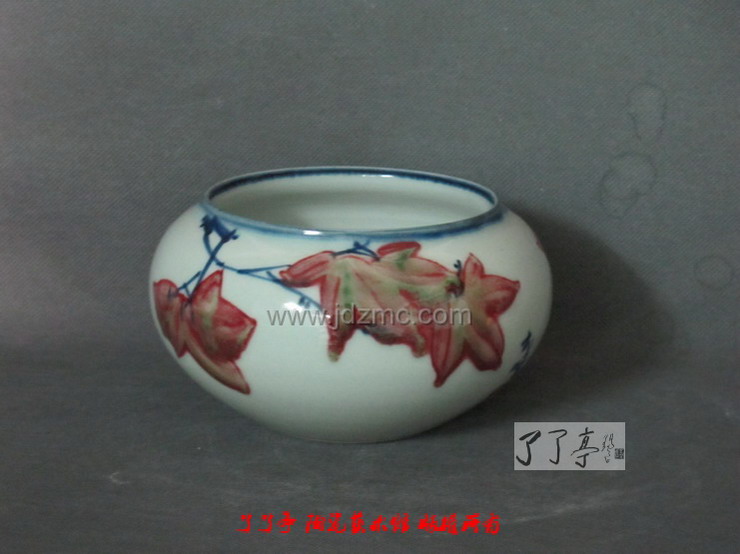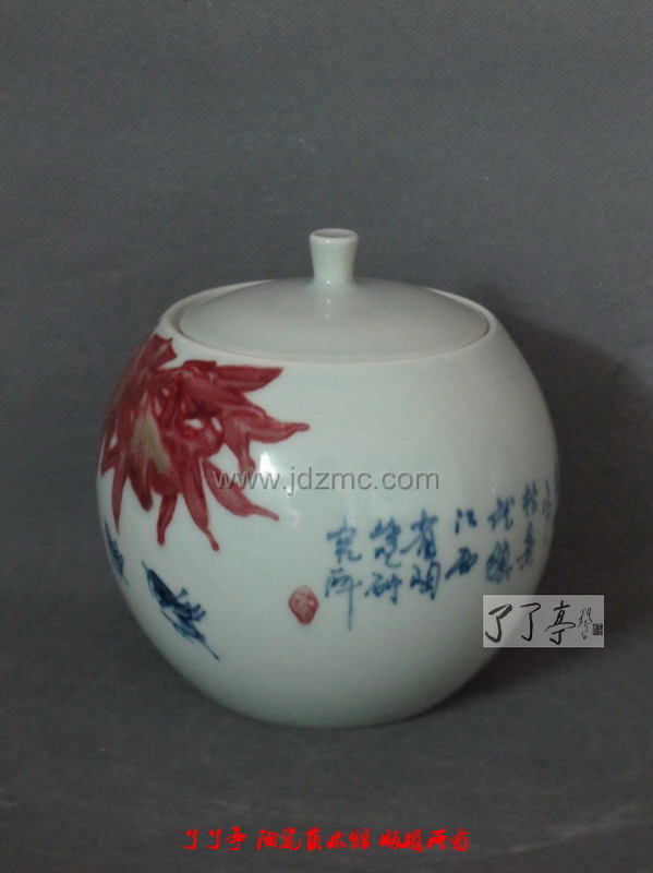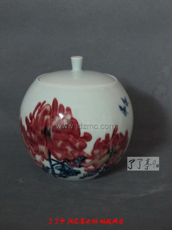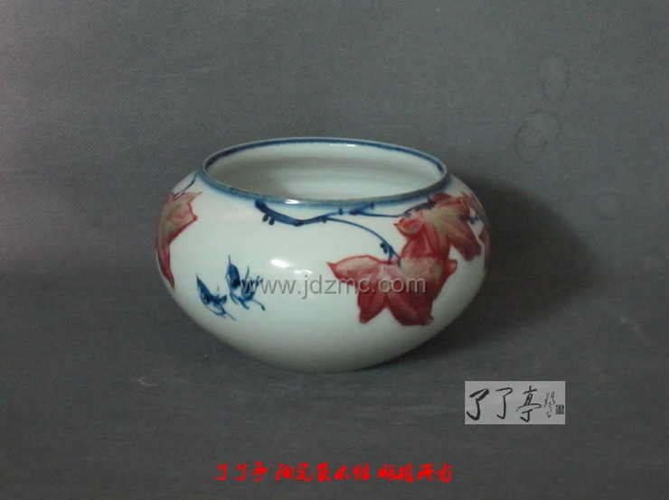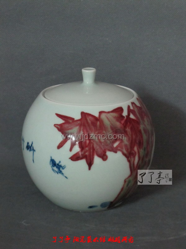 青花釉里红作品,青花是以氧化钴作为釉药,烧成较釉里红容易,而釉里红则是以氧化铜为釉药,还原烧为氧化亚铜,若是成功则有鲜红色或者绿色窑变,否则就成了灰色或者黑红色。