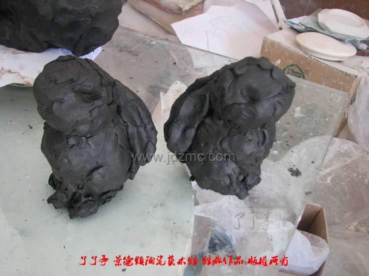 在朋友们的关心下,我们加班加点的进行了原型创作,了了亭2011年兔年生肖雕塑即将推出,此次推出的兔子雕塑预计大小为成瓷10公分左右,由两只左右形态的兔子组合在一起。此次推出的兔年生肖通体施高温颜色釉,且施釉的品种众多颜色丰富。图片中是两个不同的模种,第一套兔子设计完成后,有些偏小,但也很可爱,留为备选,第二套正在制作。