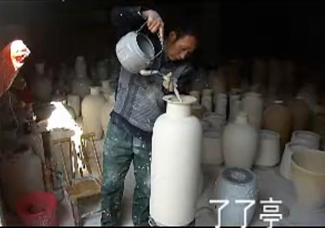 第二是荡釉,这一种施釉方法,主要用于容器的内部,将釉倒满,或者倒至容器内部一定高度,然后适当摇动,最后反扣将容器内部的釉快速倒出,而此时,釉已经通过摇动以及快速倒出将容器内部的均匀的附着了一层釉层。这一种,完全是用于容器,比如很多很高,很深的瓶子,吹釉是进不去的,荡釉是一个非常好的方法。