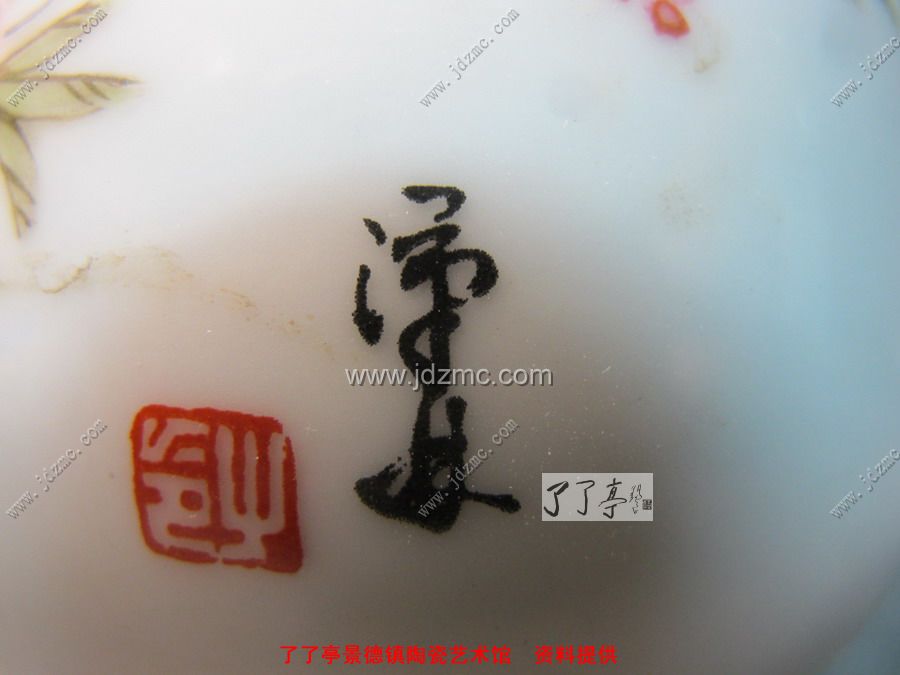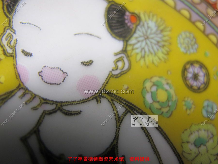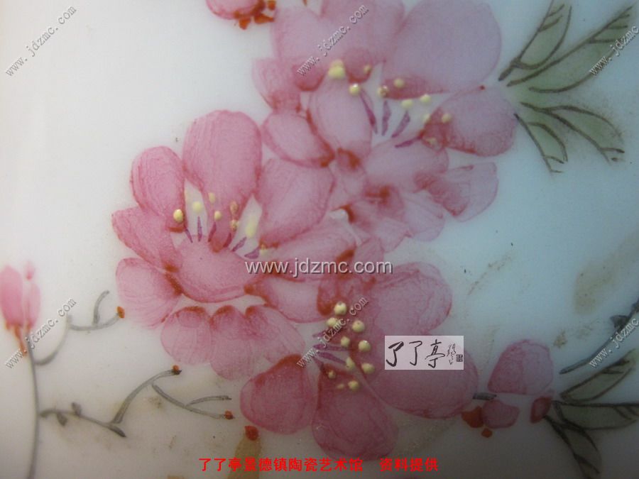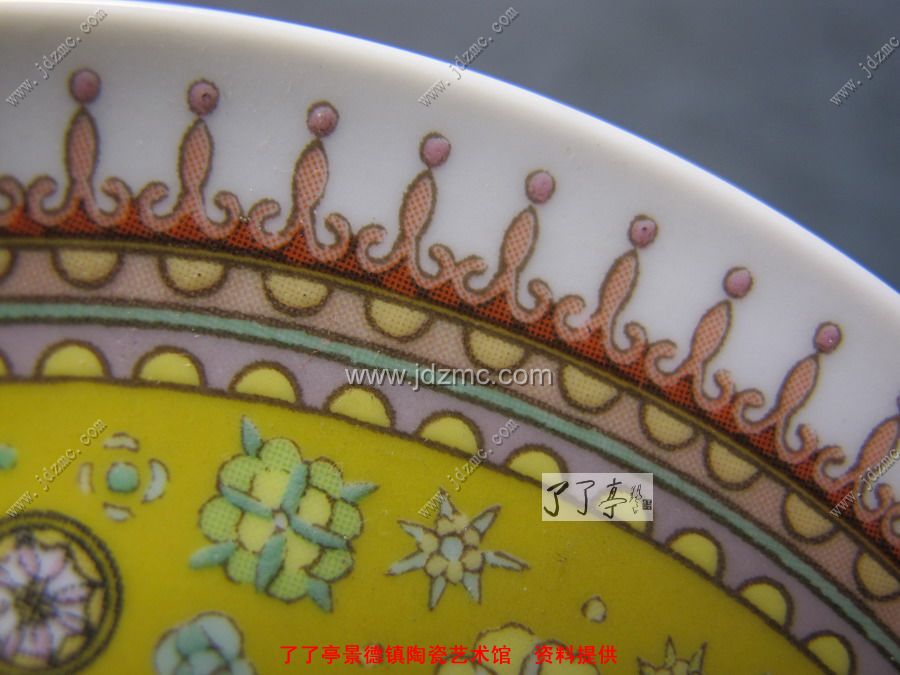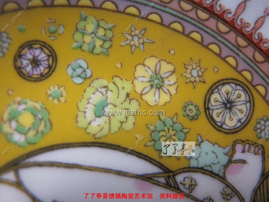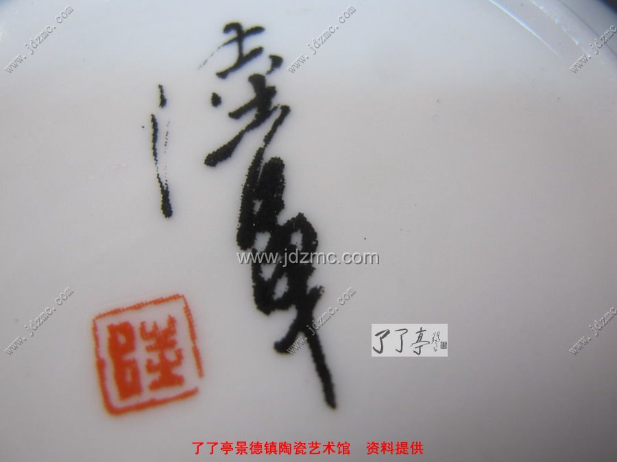 下面一个是陆军老师出的一个纪念礼品瓷盘,这个是粉彩贴花的,首先款识是贴花的没有笔触。还可以见到网状纹路。