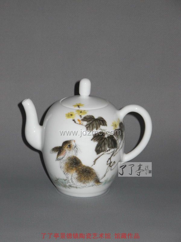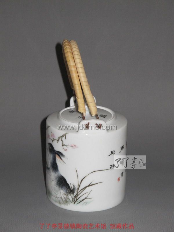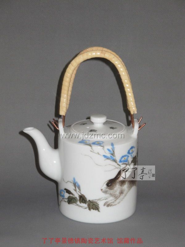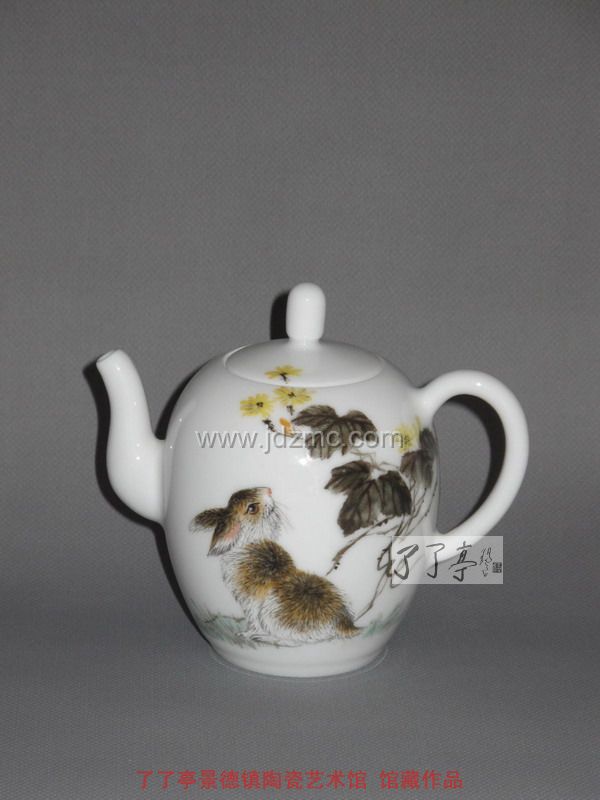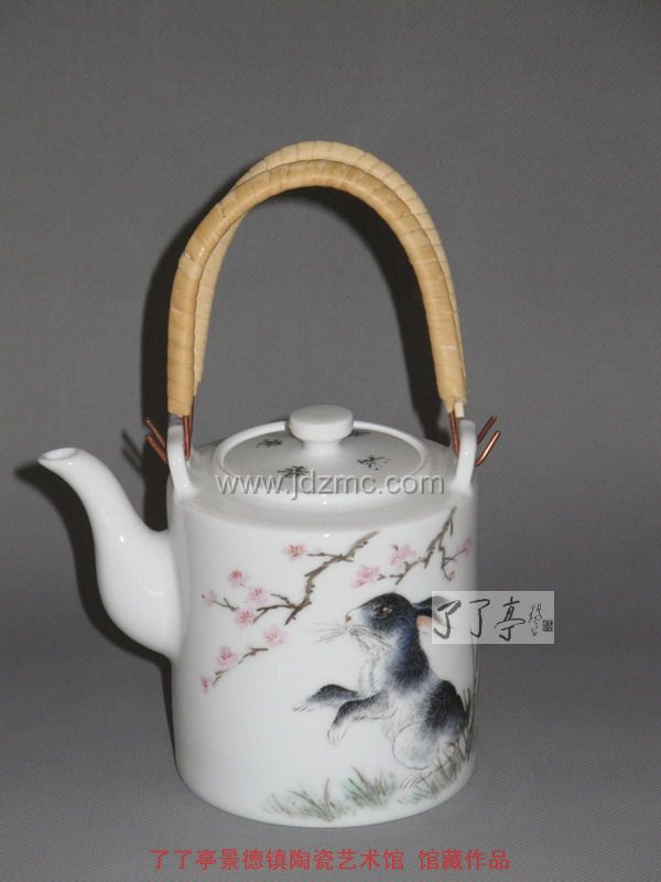 兔子是温柔可爱、敏捷聪明,以及生存能力超强的小动物,尤其毛茸茸的毫发、独特的红眼睛与长耳朵,使人一见心喜,人见人爱,因此今年兔年成为了诸多陶瓷名家瓷器上的“常客”。古往今来,在陶瓷的海洋里各种的兔子并不少见,但是釉上粉彩的走兽更需要艺术家高超的工艺与技法。今年农历兔年,吴锦华老师这四件温馨可爱,小巧谨慎的兔子画面的茶壶,把玩在手中,既有实用的价值,又有收藏的潜力,不仅为家中带来几份年气,也有着玉兔送祥瑞的美好期愿,希望家人可以沾上玉兔的吉祥和福气,年年可以健康平安幸福,家庭和和睦睦。了了亭·李申盛/文