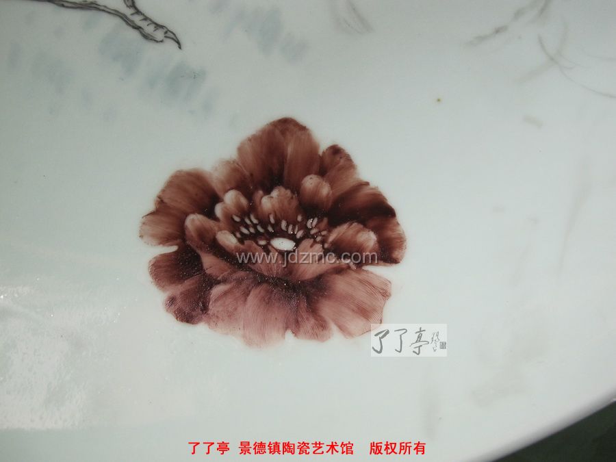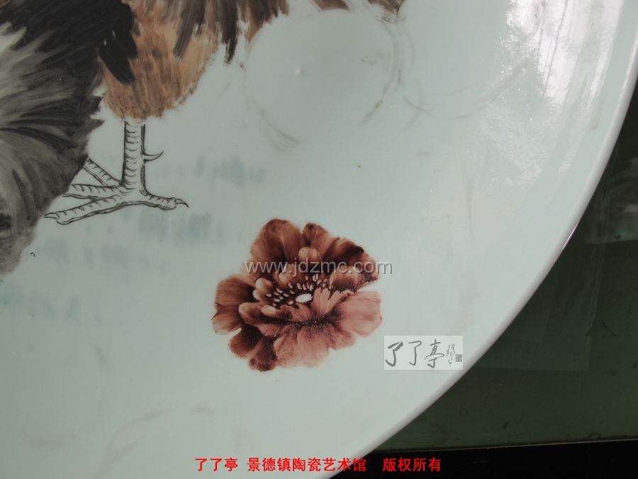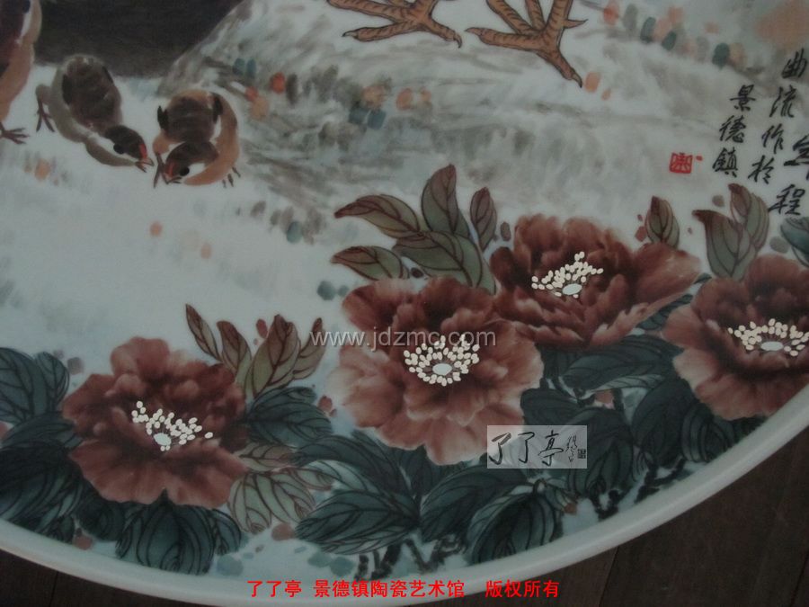 我曾经听过对一位指画艺术家的评论,说是在一个大桌子上,整齐摆放一排排瓷盘,然后用手指蘸上新彩颜料,一个盘子指压一笔,然后再更换另外的颜色,或者手指,如此反复,流水作业可成。所以,手指画给人的感觉总觉得空了点。但是,这一次我请程曲流老师演示了一下手指画的技法,我感觉认真的手指画的确有着非常了得的技术和琐碎的处理,比如画一只鸟头,一朵花瓣,一指头压下去,浓淡深浅,毛茸茸的感觉力现,这是需要相当功力的积累的,台上一分钟,台下十年功,同样的一种绘画工艺,认真与否,细节的交代,才是画作生命力的根本。了了亭·李申盛/文