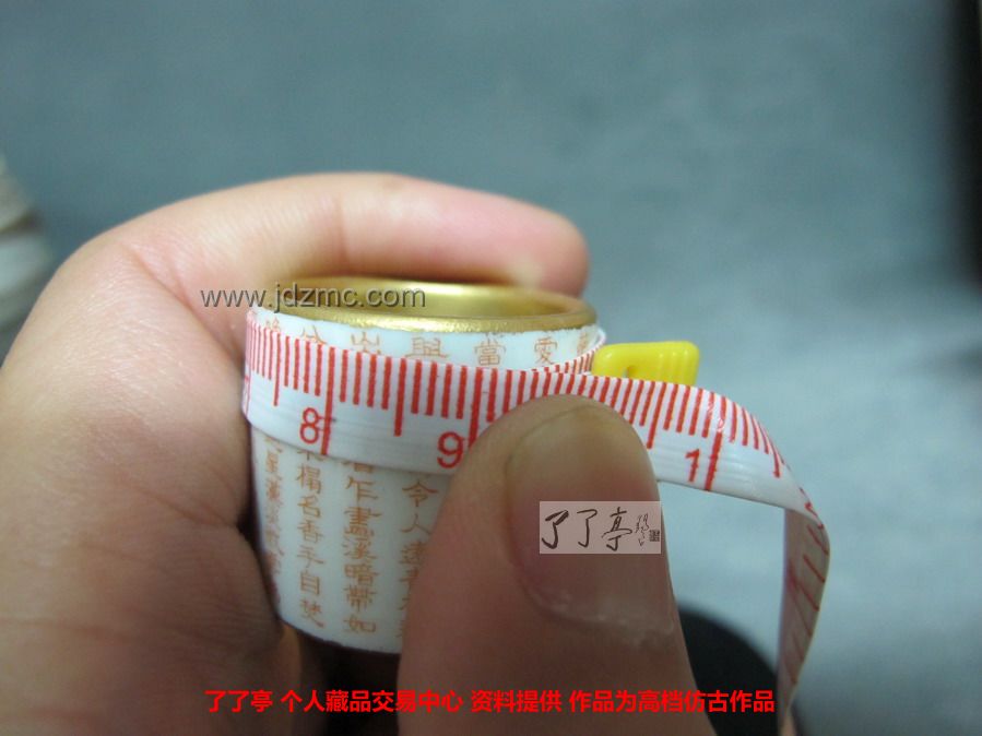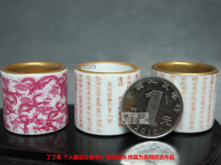 在景德镇陶瓷仿古业内,扳指作为一种特殊的仿古陶瓷制品一般不为多见,其一是因为扳指多为玉石材料,其二,扳指表面积小,对于绘制等各个方面要求很高。因而一件做工精细,纹饰清晰,小巧到极致的陶瓷扳指实为不可多得的玩物。本文图片中的三个陶瓷扳指尺寸为:高:2.5cm 直径:2.5cm 周圈:9cm分别以微字红彩书写“夏日园居即事五首”: