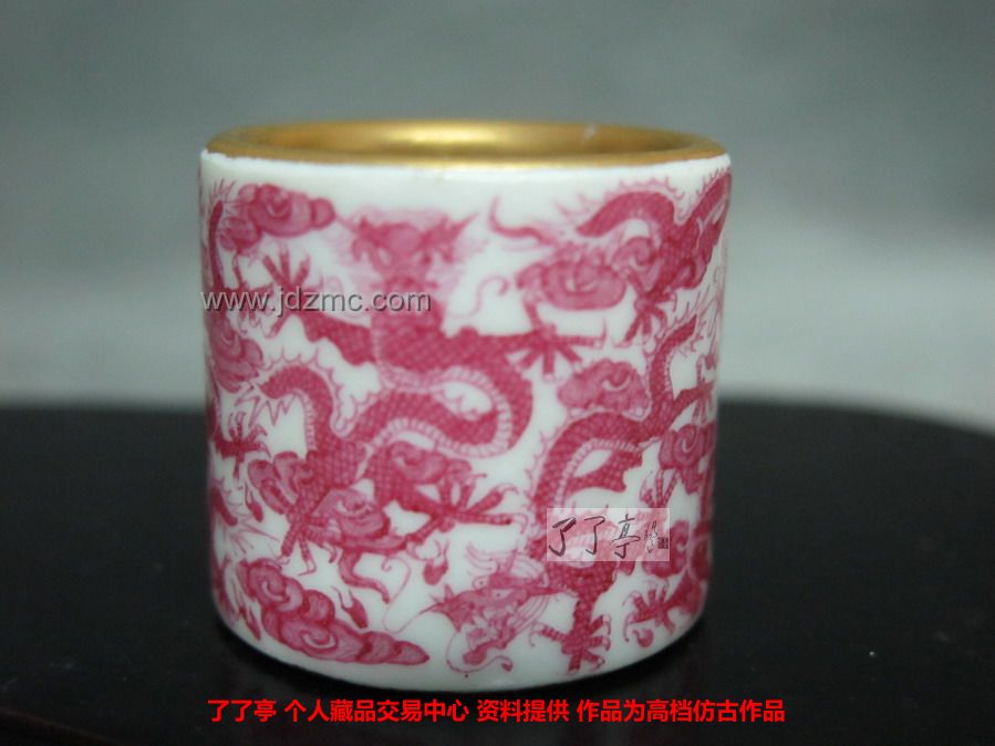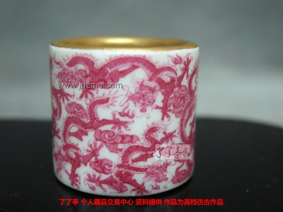另外一件是宝石红九龙扳指,乾隆年制款识的瓷扳指九条神态各异的五爪龙里面包有金粉做工精细。
