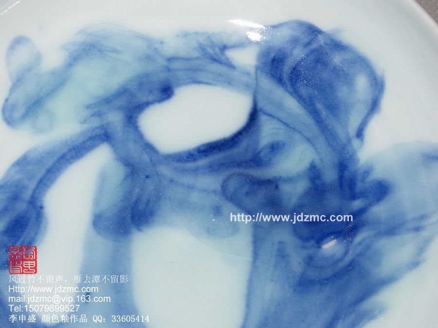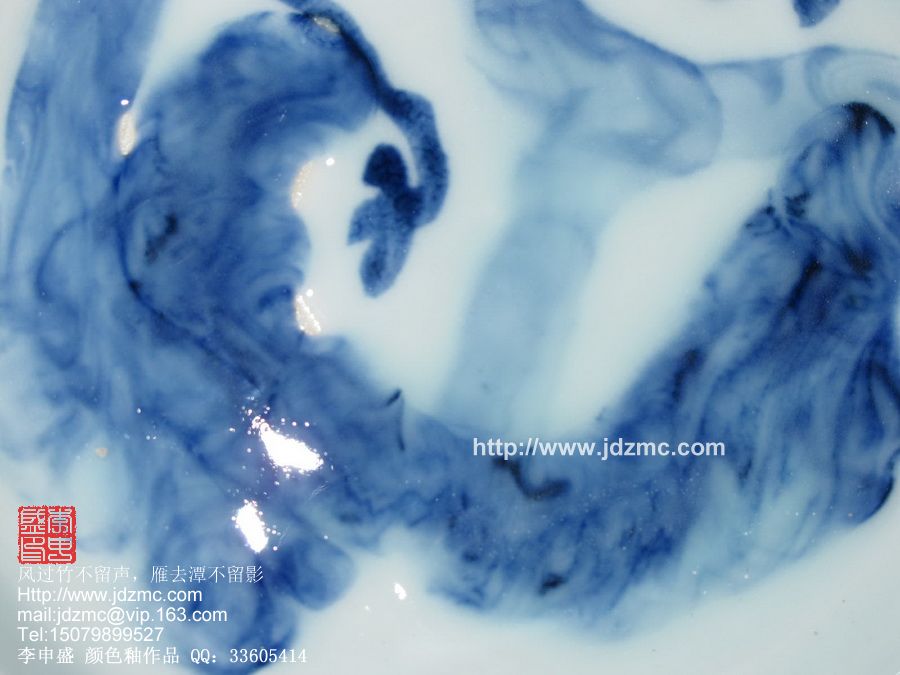 “青花妙境”系列正是我在探寻的一个新的表现手法,它能释放每一位观者的想象力。当青花浸入釉体之中,依靠独特的工艺手法,将一大团青花料由浓而淡,最后无边地蔓延开来,丝丝缕缕流淌于釉水中,又如烟雾般地弥漫,造就一幅幅微观的奇景。这中的每一幅都是独一无二的,不可重复的,为当天成,为当神赐。
