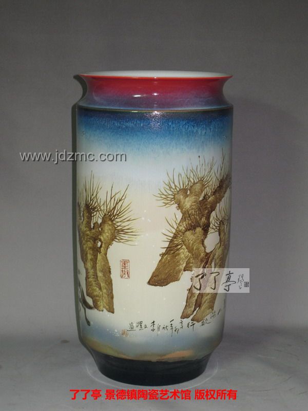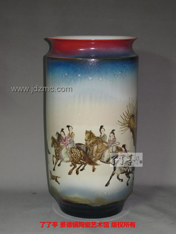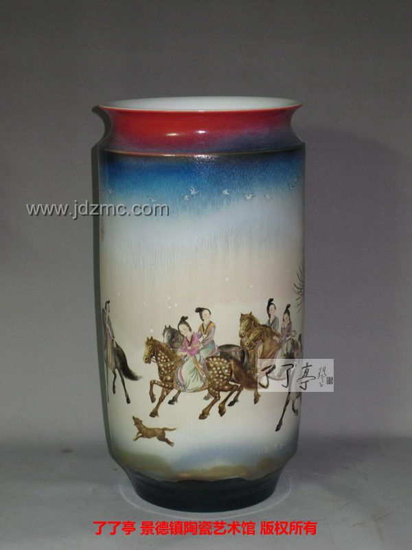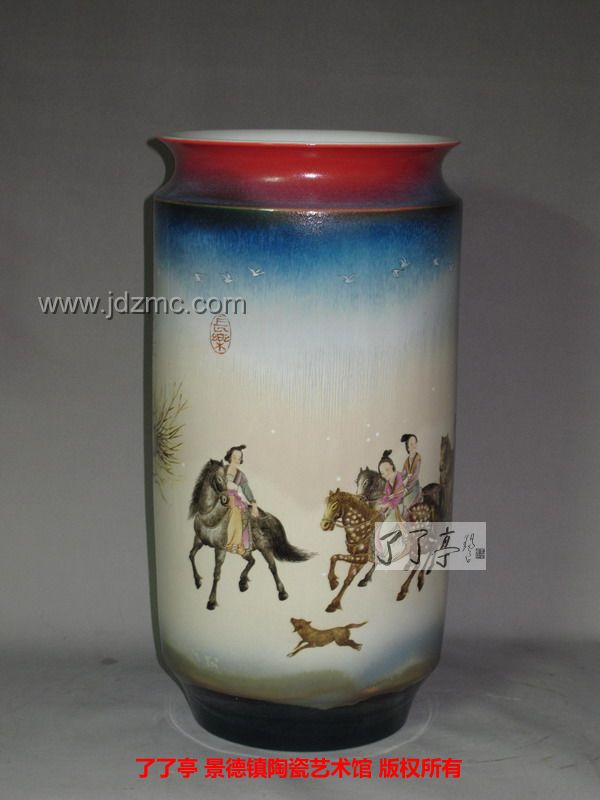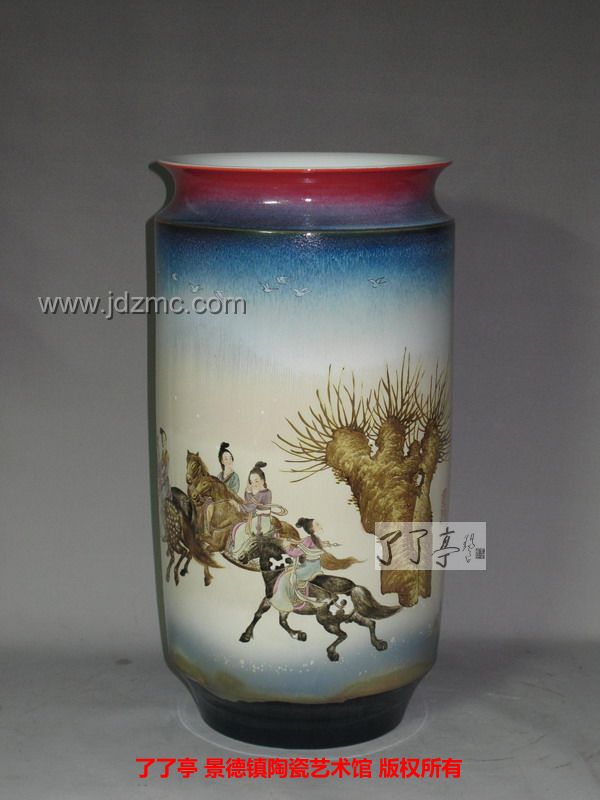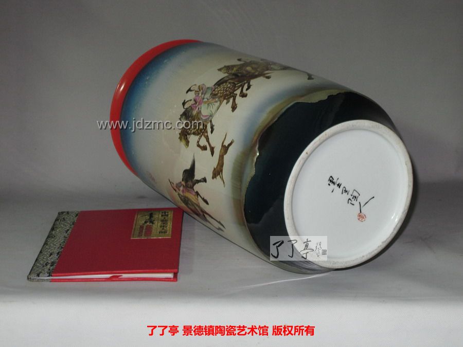 "了了亭"早在十年前就拜访了李文跃和他的父亲:艺术瓷厂的骨干画家李镇生,很推崇父子俩的艺术水平.2000年在李文跃家中看他和王锡良,刘远长合作为联合国绘创的粉墨彩大缸,绘的是清代皇家花园.那种艳丽,辉煌,尽显皇家气派:那种细腻,精确,遍布全作品的一队队几十上百个人物,高只有一厘米,可是手脚头脸,衣饰道具,交待得清清楚楚:简直是匪夷所思.影象深极.听说2006年审批中国工艺美术大师的时候.当李文跃的大缸出现在评委们面前时,引起了一阵感慨。