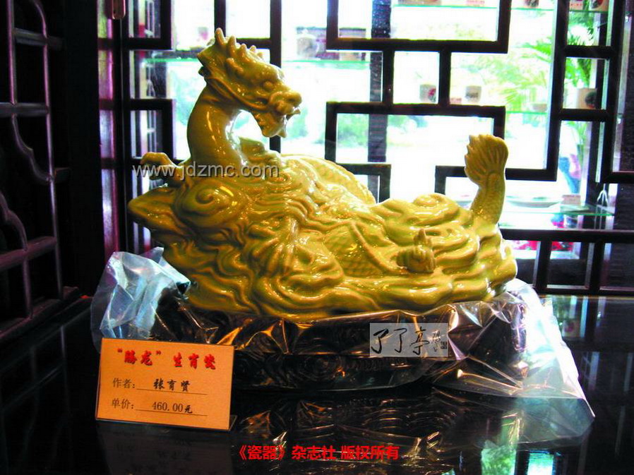 在《盛世腾龙》的旁边,是刘远长1999年创作的《千禧龙》生肖瓷,“《千禧龙》是刘远长的经典作品之一,市场认可度很高,一直保持着热销的状态,可谓年年卖月月卖。”李申盛的母亲陈也君认为,生肖瓷的设计非常重要,也是产品保持热销最关键的地方,《千禧龙》就是一个很好的例子。