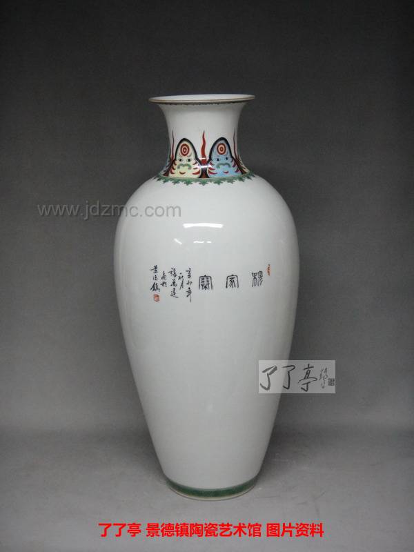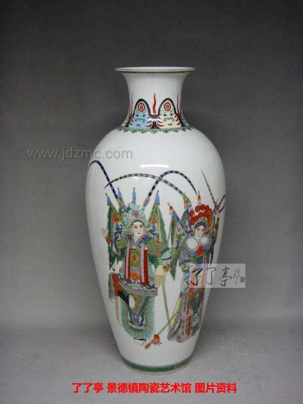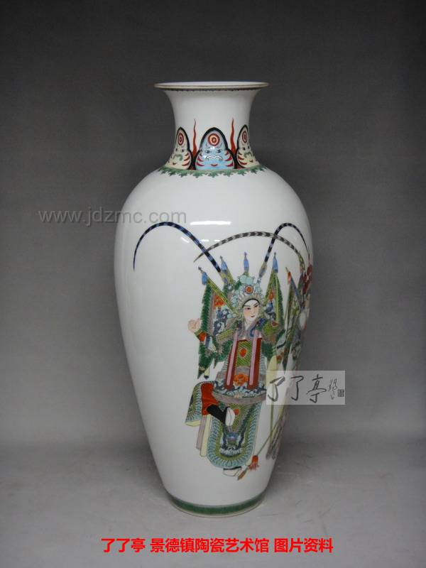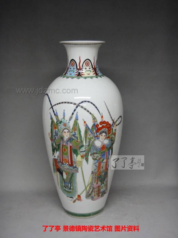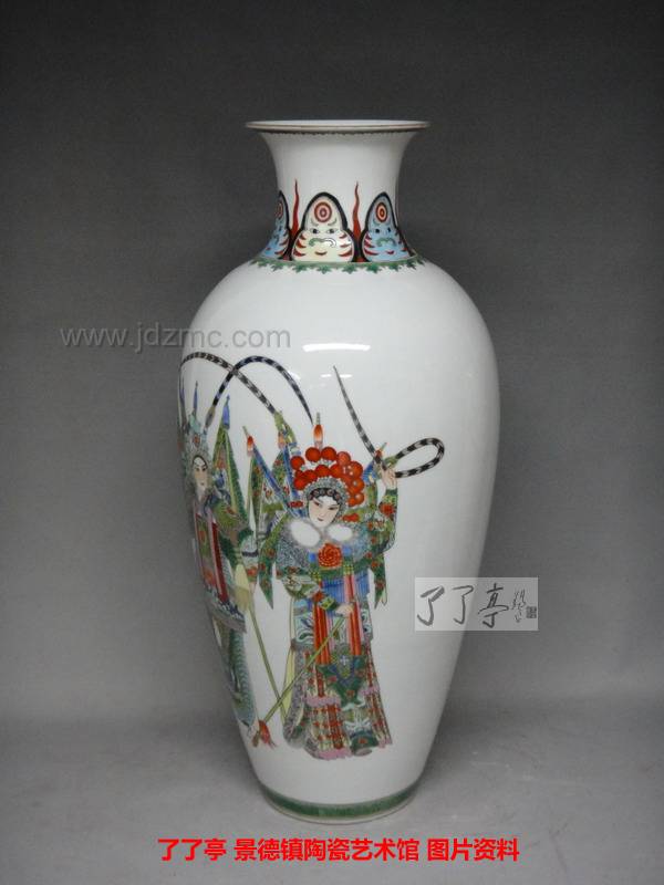 张万莲今年在保利拍卖的的一件作品,也是她定位在她艺术人生中的高端作品中的一件。这类作品存世量很少,但是我还是请她帮我画了一件,之所以喜欢京剧,或者说在陶瓷上面表现京剧的这类形式,它可以是粉彩,新彩,可以是青花,可以是颜色釉,但是古彩有她特殊的美,美哉那份传统,美哉那份古香古色。因此景德镇形成了一面流派主题叫做瓷画京剧。戏曲本身就是美的艺术,用陶瓷艺术的语言中的古彩来诠释京剧,那会是一种怎样的味道?