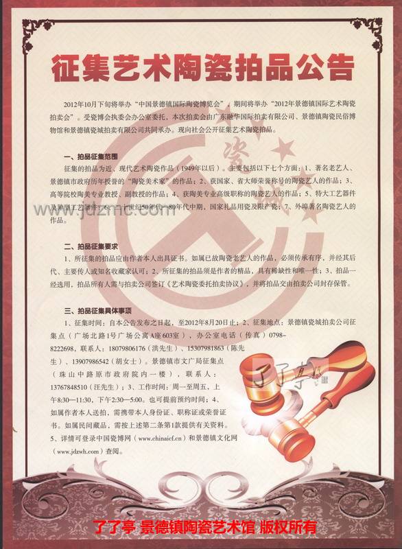 2012年景德镇国际艺术陶瓷拍卖会,征集艺术陶瓷拍品公告 在本文尾部,请查阅。
