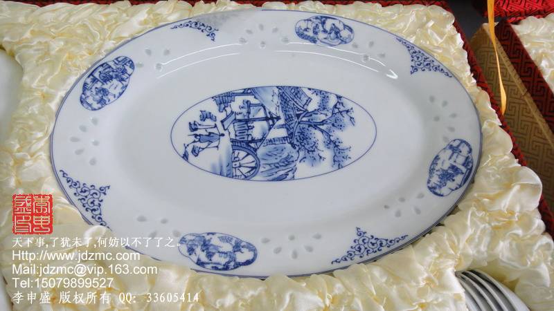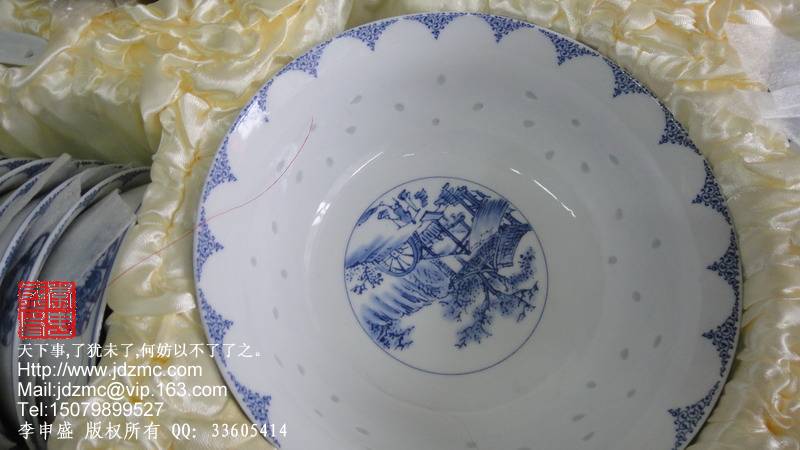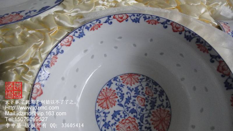 三,景德镇青花玲珑陶瓷餐具目前分为青花玲珑和釉中彩玲珑,青花玲珑顾名思义,是釉下青花加玲珑效果。而釉中彩玲珑是景德镇的玲珑白胎成瓷后,贴釉中彩花纸,在1250摄氏度的条件下,高温封闭釉中彩,称为釉中玲珑。目前真正玲珑效果的瓷器,只有景德镇做的出来,其他的产瓷区我在景德镇尚未发现有能够模仿的。釉中彩玲珑和青花玲珑除了烧成过程的区别外,青花玲珑因为一次成型普遍瑕疵,问题较多。而釉中彩玲珑,是先挑选了玲珑白胎,然后贴釉中彩花纸再最终成型。这样,在挑选的质量上能够保证,所以一般瑕疵率很低。但是釉中彩和青花是不一样的,青花亮度高,釉中彩色彩比较暗淡。