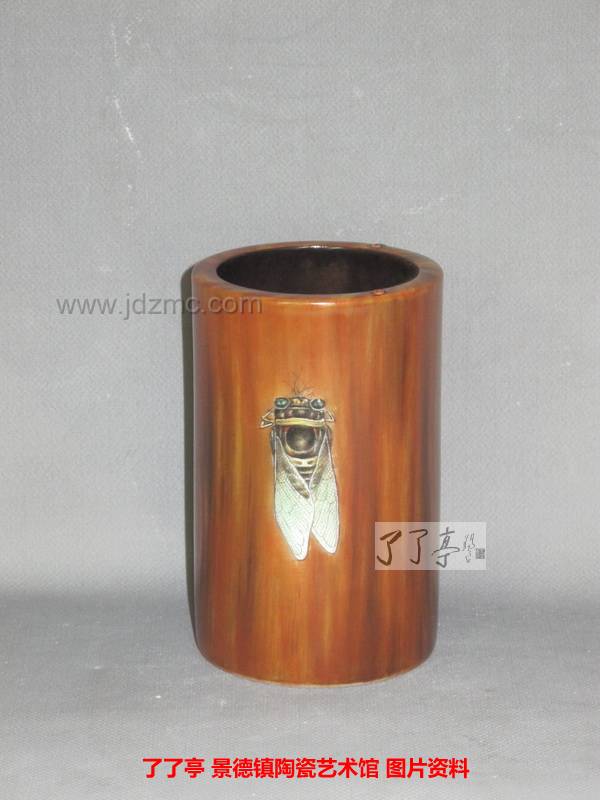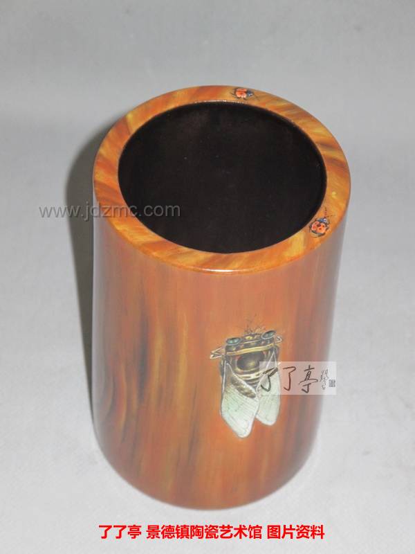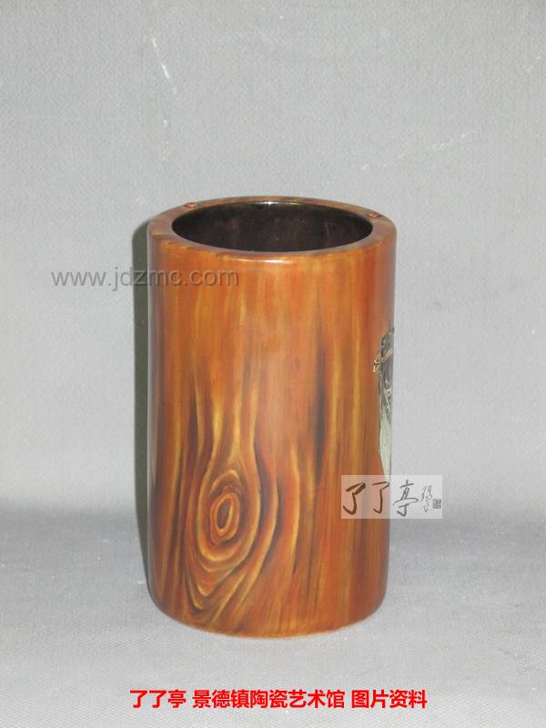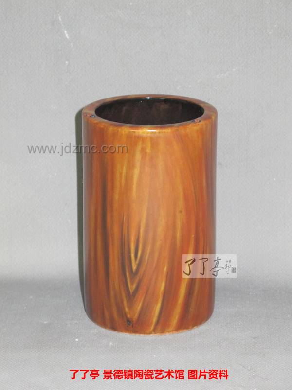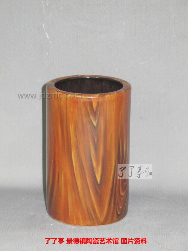 这个瓷器表面的‘木纹’其实是一种釉上彩色,釉上彩是在烧成的瓷胎上,以各种釉上彩勾涂出木材的年轮纹理,枝杈疤痕及色彩质感,经900多度高温红炉烧制后,呈现出一种酷似天然木材的艺术效果。这个里面之所以要达到900度,主要是为了让白胎的原始青釉发汗,使得釉上彩的颜色熔融到其中,从而使得釉上彩也能产生高光效果,酷似自然的纹理。