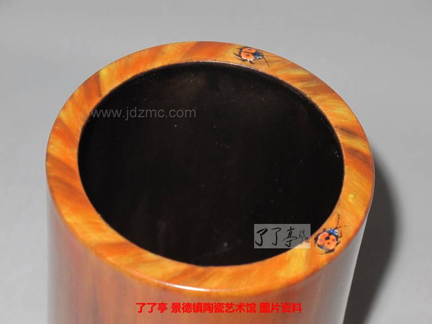 木材的年轮纹理、枝杈疤痕清晰可见……乍一看,像个久已陈旧的木桩。“呵,你可千万别被它的外表所迷惑。这是徐国明老师重工的一件达到清代乾隆时期官窑器水平的木纹釉的作品。”