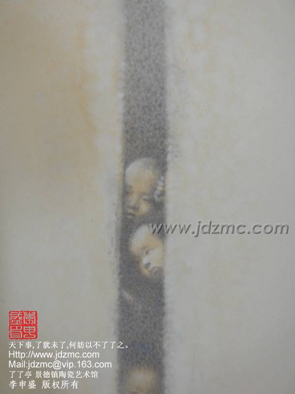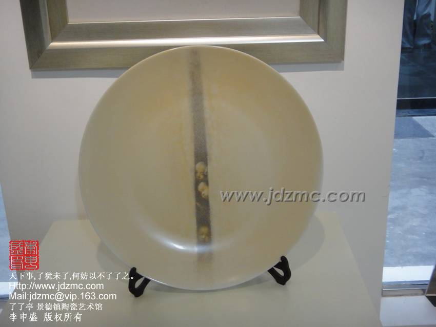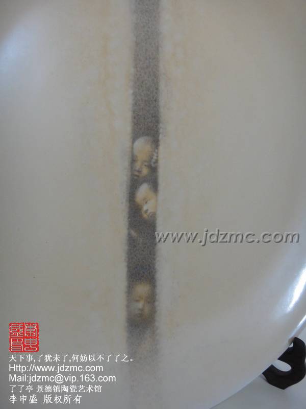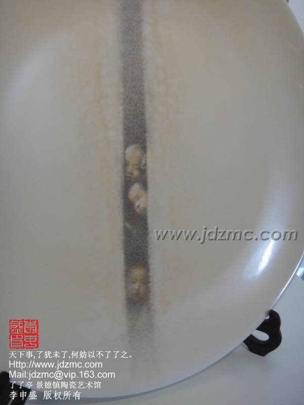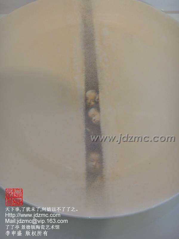 这块瓷盘从构图,用笔,设色,均讲究到了极致,临画于眼前,如文心拂面,如跨越一段时空与自己故去的童年时光期遇,这是一种创新,一种新意,一种将文化衍生到其中的作品,才华横溢......这便是我见过的王勇老师,,儒雅敦厚,平和随意,谦逊中透锐气,淡然中显风骨,颇有高士之风,名士之节。景德镇需要更多这样的艺术家投入其中,让景德镇的陶瓷绘画激荡这文化,真正的成为艺术享受。了了亭 李申盛/文