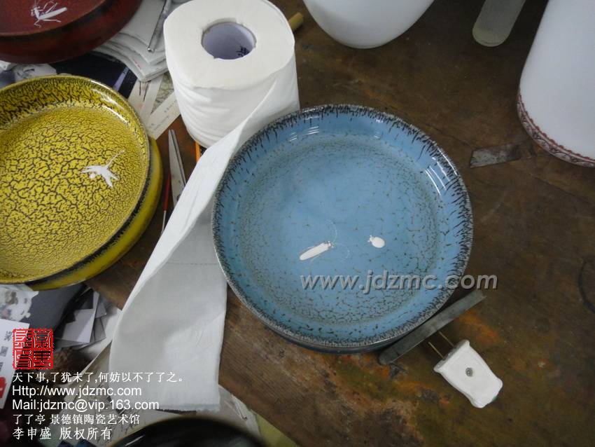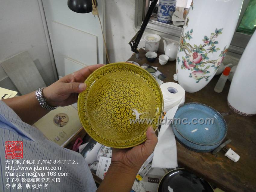 还有一个密色釉的盘子,可惜过第一道火的时候就起惊了,图片上面就是一条横线,将玻璃白切开了,那就是起惊的作用。