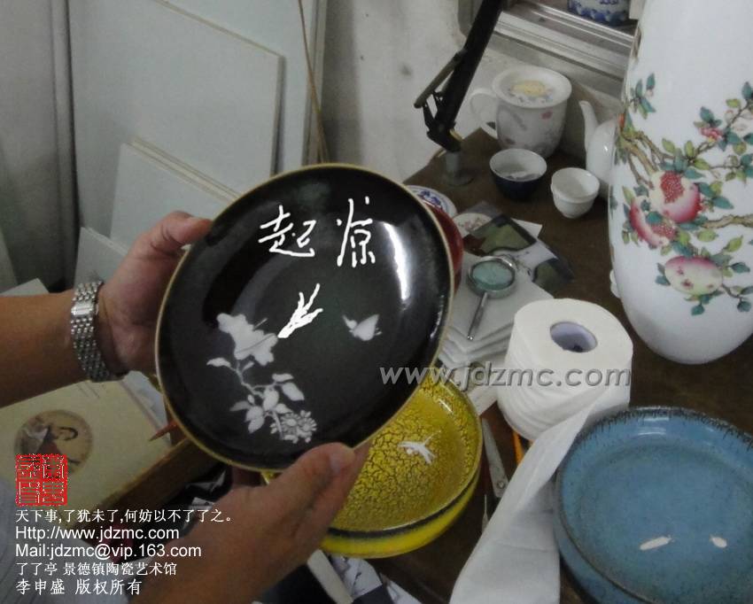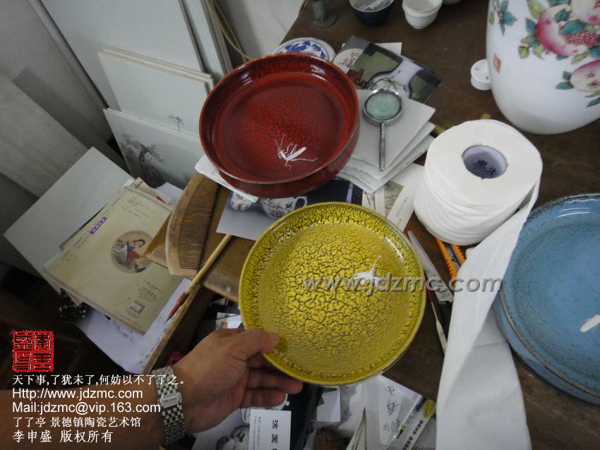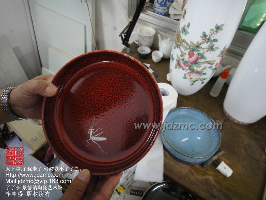 我将三原色的漆器系列的茶盘给徐国明老师送了过去,请徐老师代为斗彩点小昆虫在上面。图为半成品。
