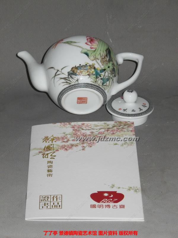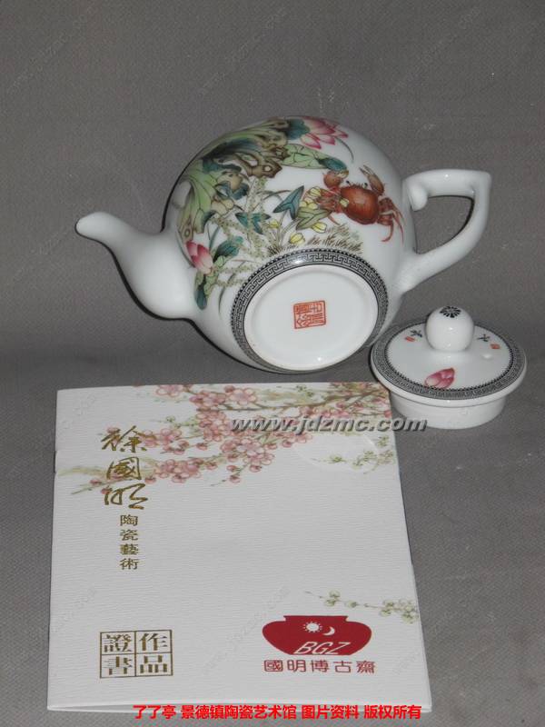 所以,虽然提到“和谐”二字,总让大家觉得有点冠冕堂皇,但是,在徐国明老师的成品上,我当初的想法最终还是给否定掉了。以前商讨这个画面,更多的是考虑我喜欢的螃蟹。个人呢喜欢螃蟹,本来是希望徐国明老师提“铁甲将军”“横行天下”之类,这等激进的言语,就像我请徐国明老师在我设计的织金釉茶盘上画了一个极其逼真的蜘蛛,我写证书的时候,写的是“纸醉金迷”“啪”后脑勺挨了母亲一巴掌。