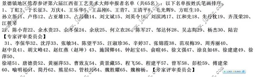 景德镇地区推荐参评第六届江西省工艺美术大师申报者名单(共65名):以下名单按姓氏笔画排序:
