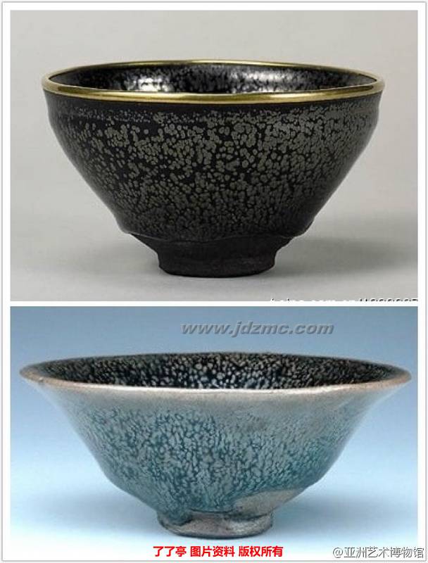 【北宋的徽宗在玉阶丹陛上,把盏挹盌,呼臣斗茶。在黑釉的肤色上,观白沬青黄,鉴水浅茶痕。把火与土凝炼的玉毫紫瓯,油滴鹧斑,视为碎玉锵金。把“带露和烟捣碎”化入口中的啜英咀华,两腋清风。天下效尤。然非也!白沬中酿着奢靡,茶渍里藏着颓废,釉中的结晶内,几丝铁锈红,几滴灰蓝泪,一声叹息。】