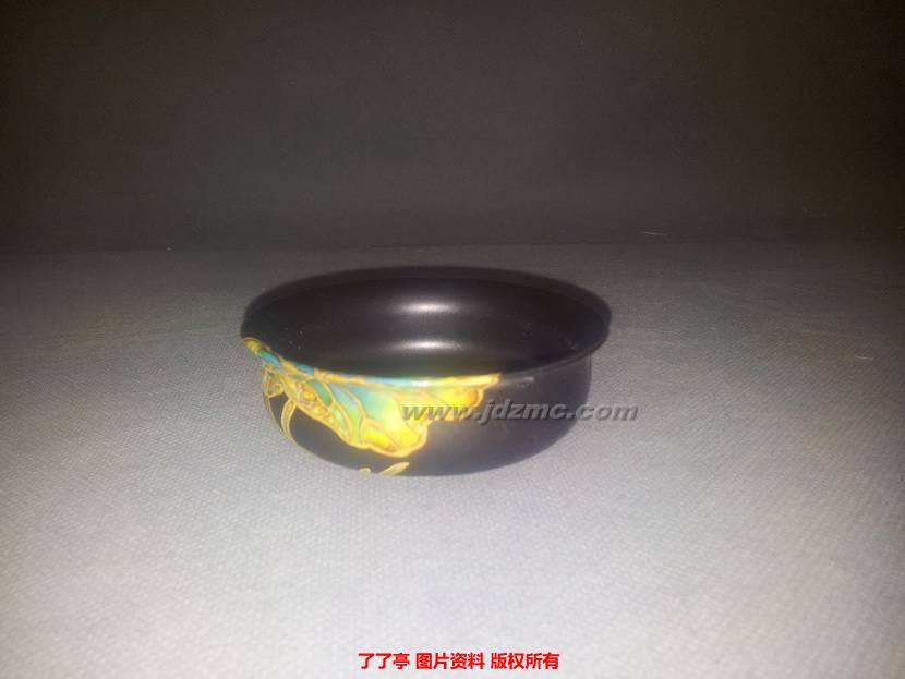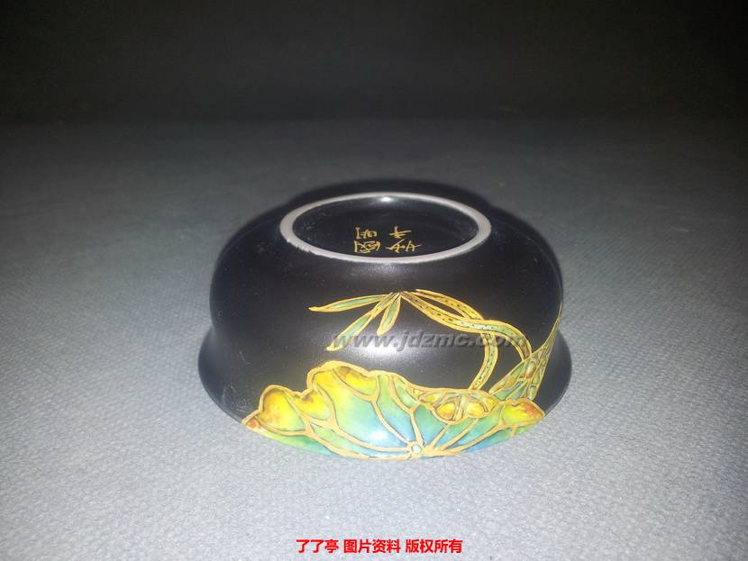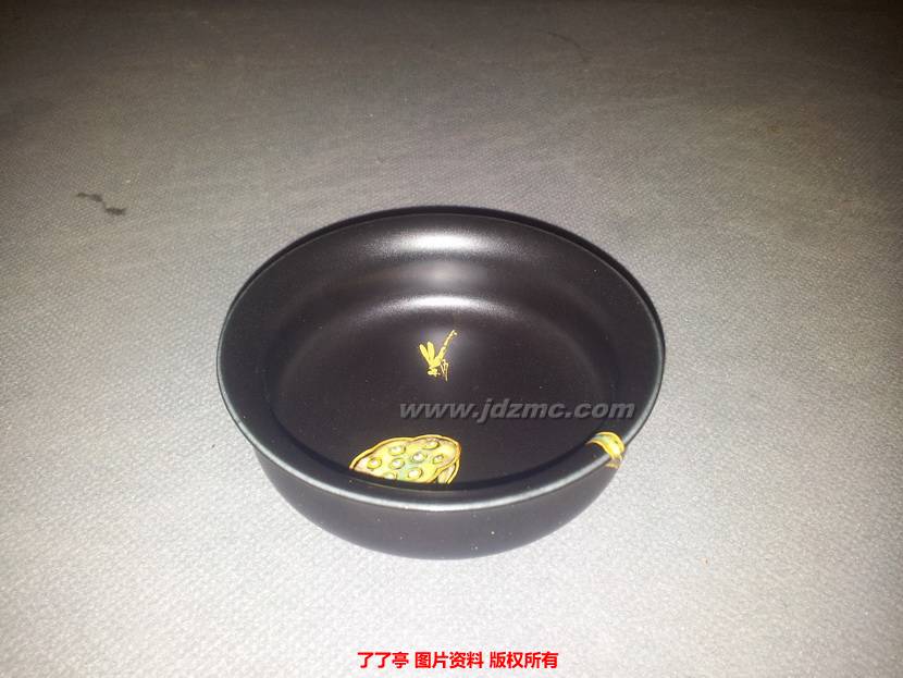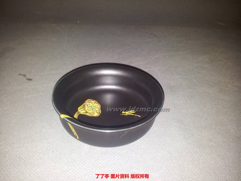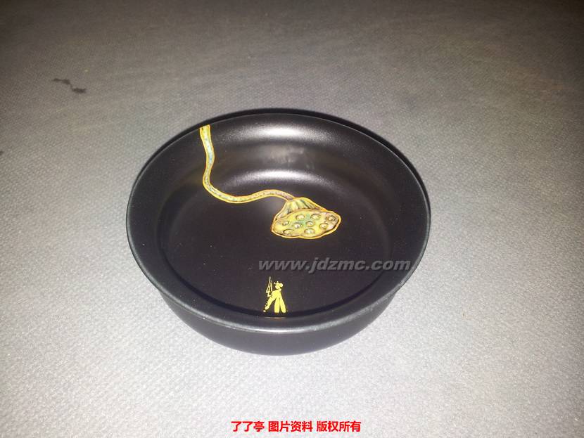 因而,一件作品,要做到真是好,就需要的是那种素面朝天的明净、妩媚;……在下面的这两件作品里,无光代表了一种深邃,黑代表了一种高贵,在无光黑釉瓷胎上,纯金勾线,一片荷叶,一朵莲蓬,是那样的纯粹,那样的舒缓。这将历经千万年的美品,看过,朝政变乱、命运升沉这样的“大事”,她并不留意,她留意一朵花、一种结界、是时空的颜色、是深夜的暗香。这是我将制胎之美,与徐国明老师绘画之美微妙的结合在一起,两者耽溺,可消永夜。美品层出不穷,一件一件地流连下去,跨过时空,让后世瓷工常常会想,瓷器原来竟可以这样玩的……了了亭 李申盛/文