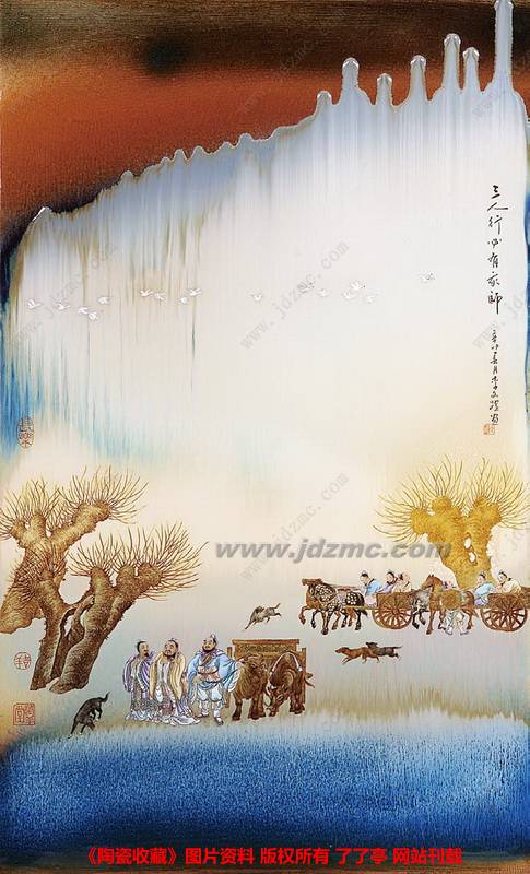 作品《三人行必有我师》是李文跃高士题材的经典之作,粉墨彩作品《伯乐相马》瓷瓶亦是其高士题材的代表之作,但其意境则更为空阔旷达。浩然长空,大雁翔集,一袭白衣的伯乐在古道西风中远眺,身边有数匹精壮骏马相伴,“世有伯乐,然后有千里马”之意境跃然画中。 李文跃凭其深厚的古典修为,以文人的眼光重读历史典故,并将心中所得完美释于瓷画当中,在浓浓古风中渲染出耐人寻味的塞外史话新画卷。